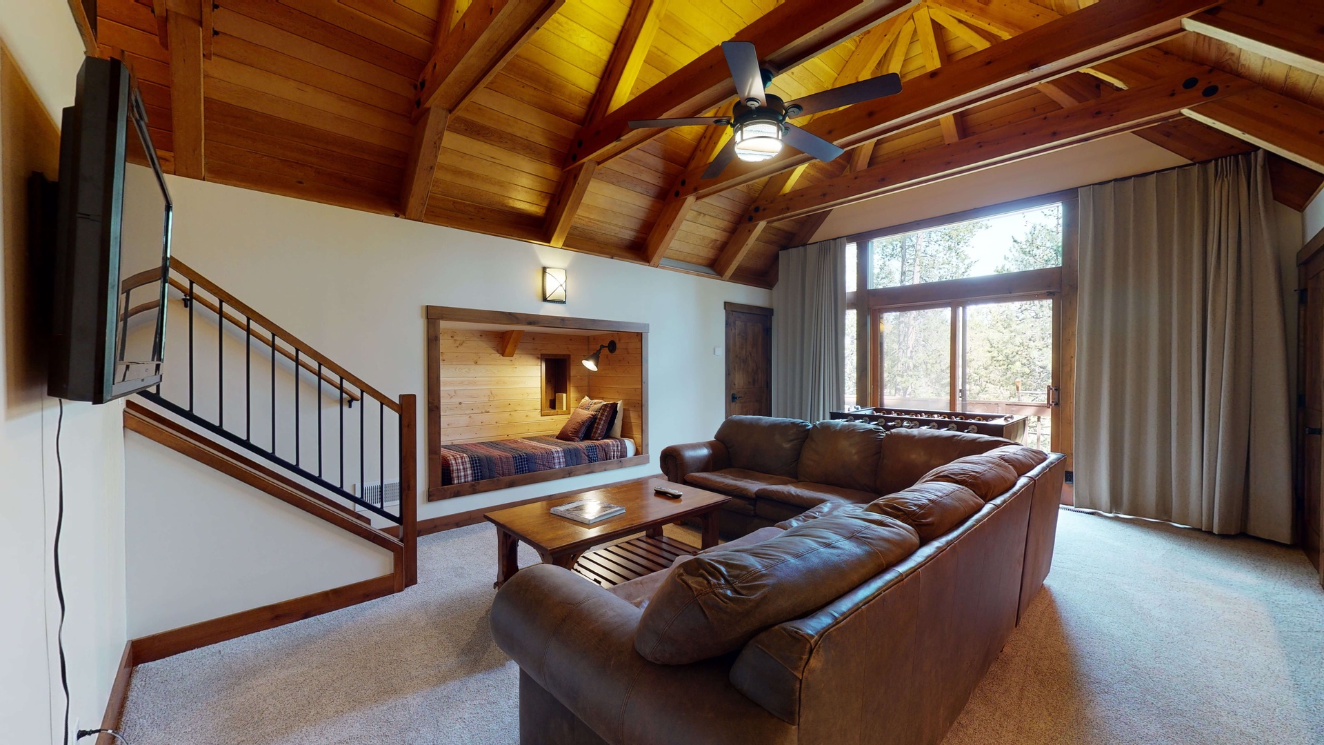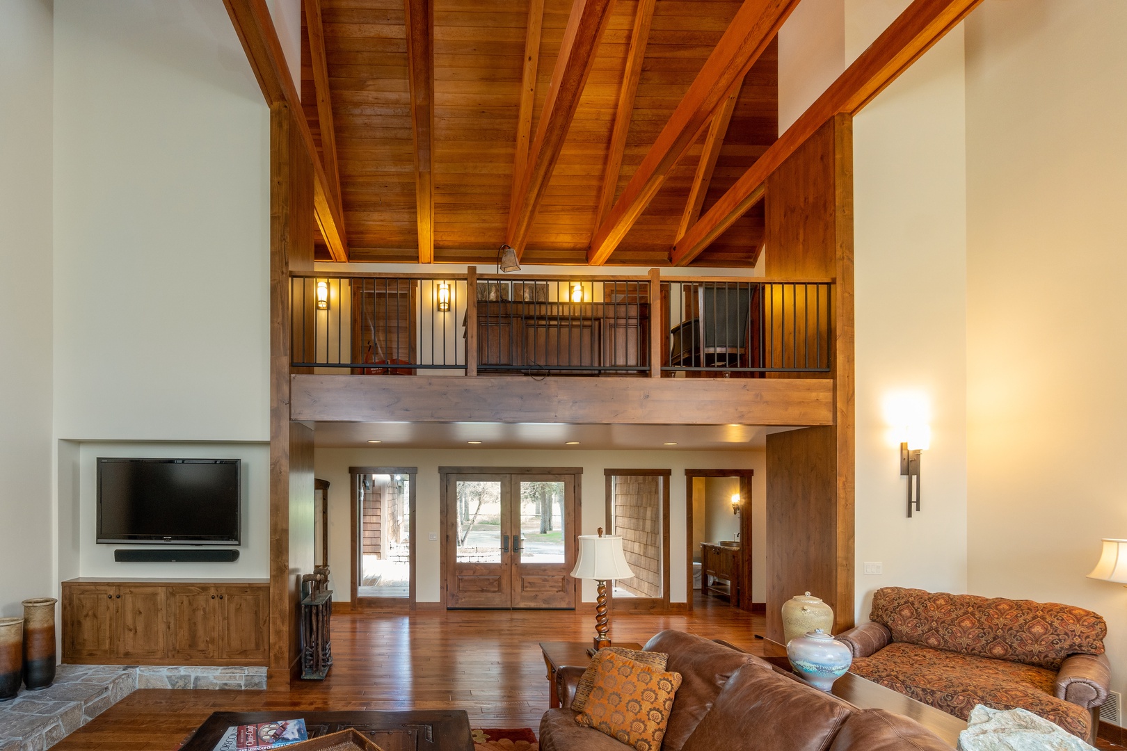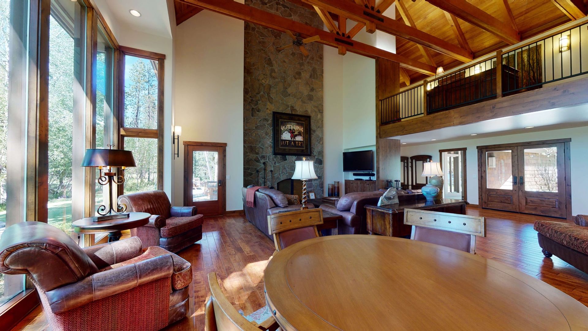 Great room featuring 25-foot vaulted wood-beam ceiling, massive wood-burning stone fireplace, family game table, large flat-screen TV, lodge-style reading chairs, and overstuffed leather sofas. A beautiful spot to enjoy the views of Mt. Bachelor or watch the action on the 8th fairway and green.