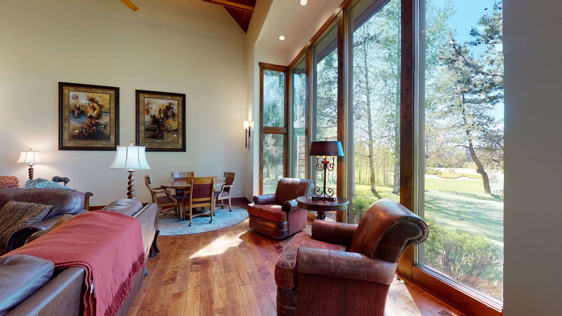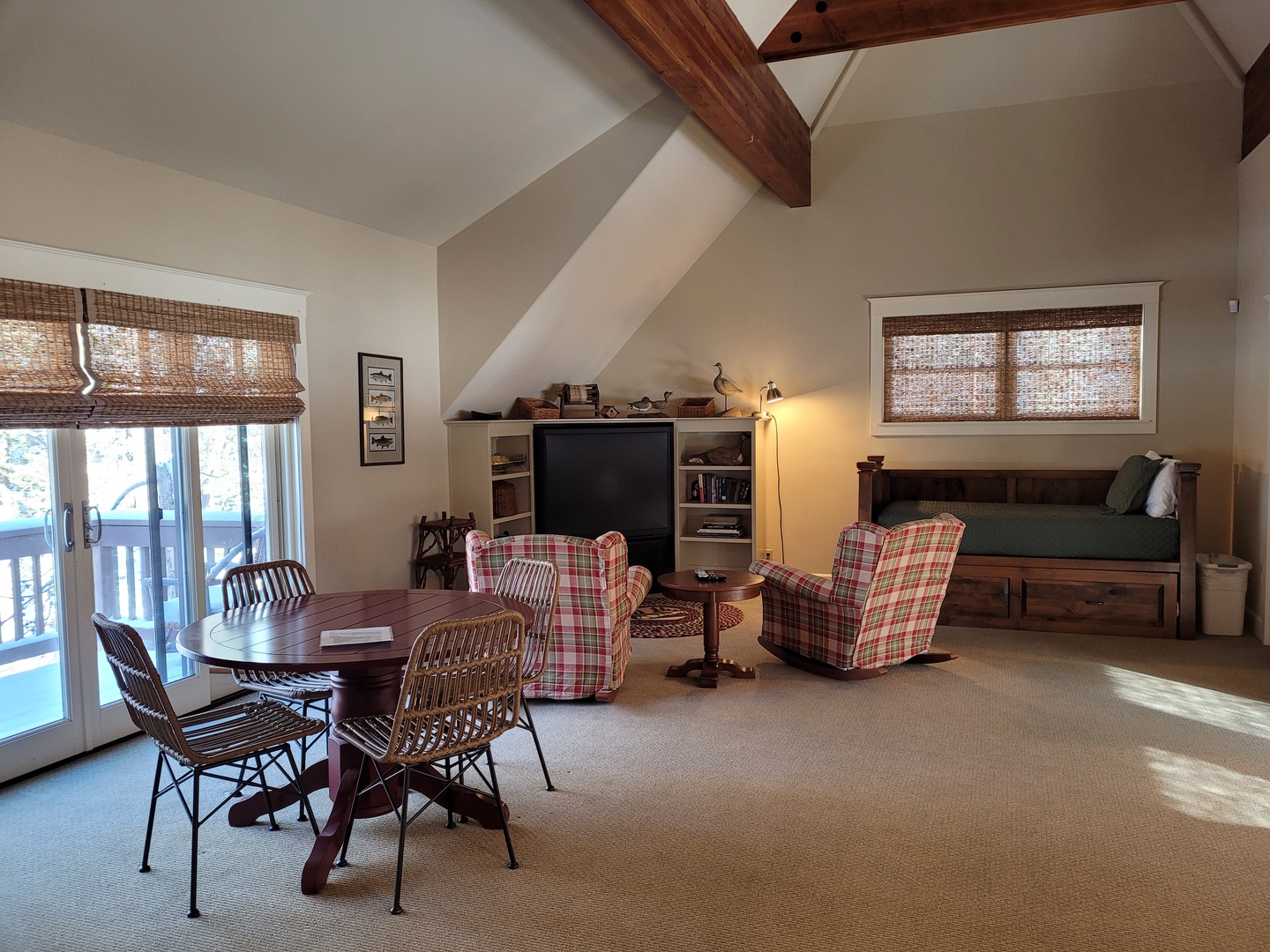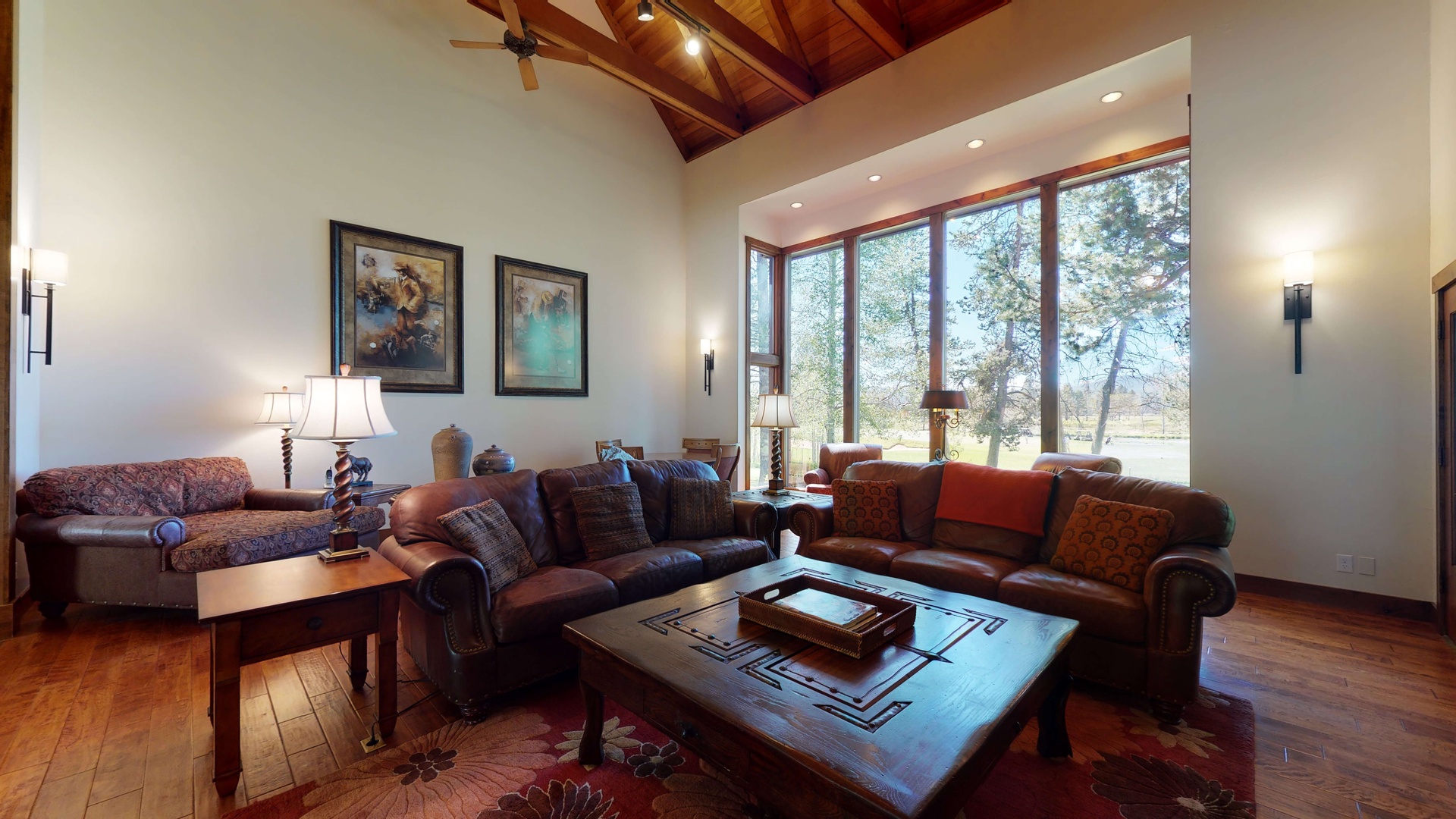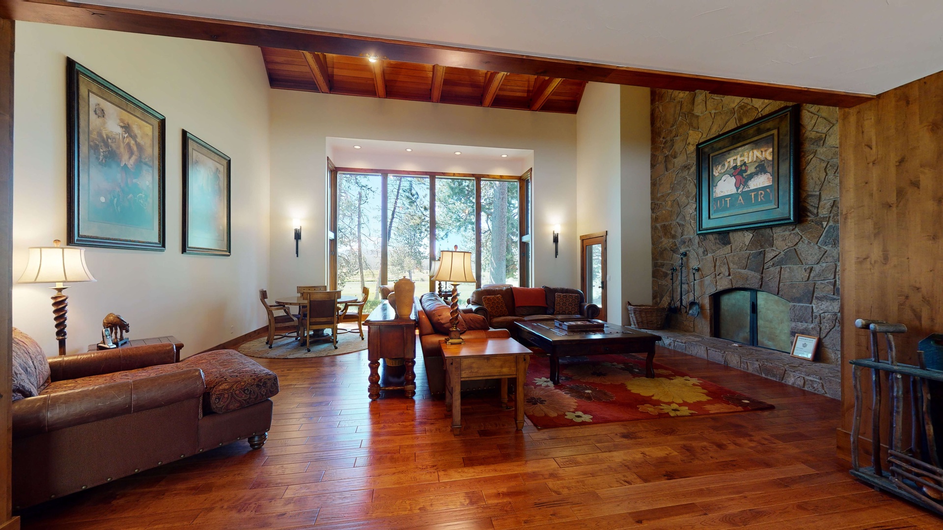 Great room featuring 25-foot vaulted wood-beam ceiling, massive wood-burning stone fireplace, family game table, large flat-screen TV, lodge-style reading chairs, and overstuffed leather sofas. A beautiful spot to enjoy the views of Mt. Bachelor or watch the action on the 8th fairway and green.
