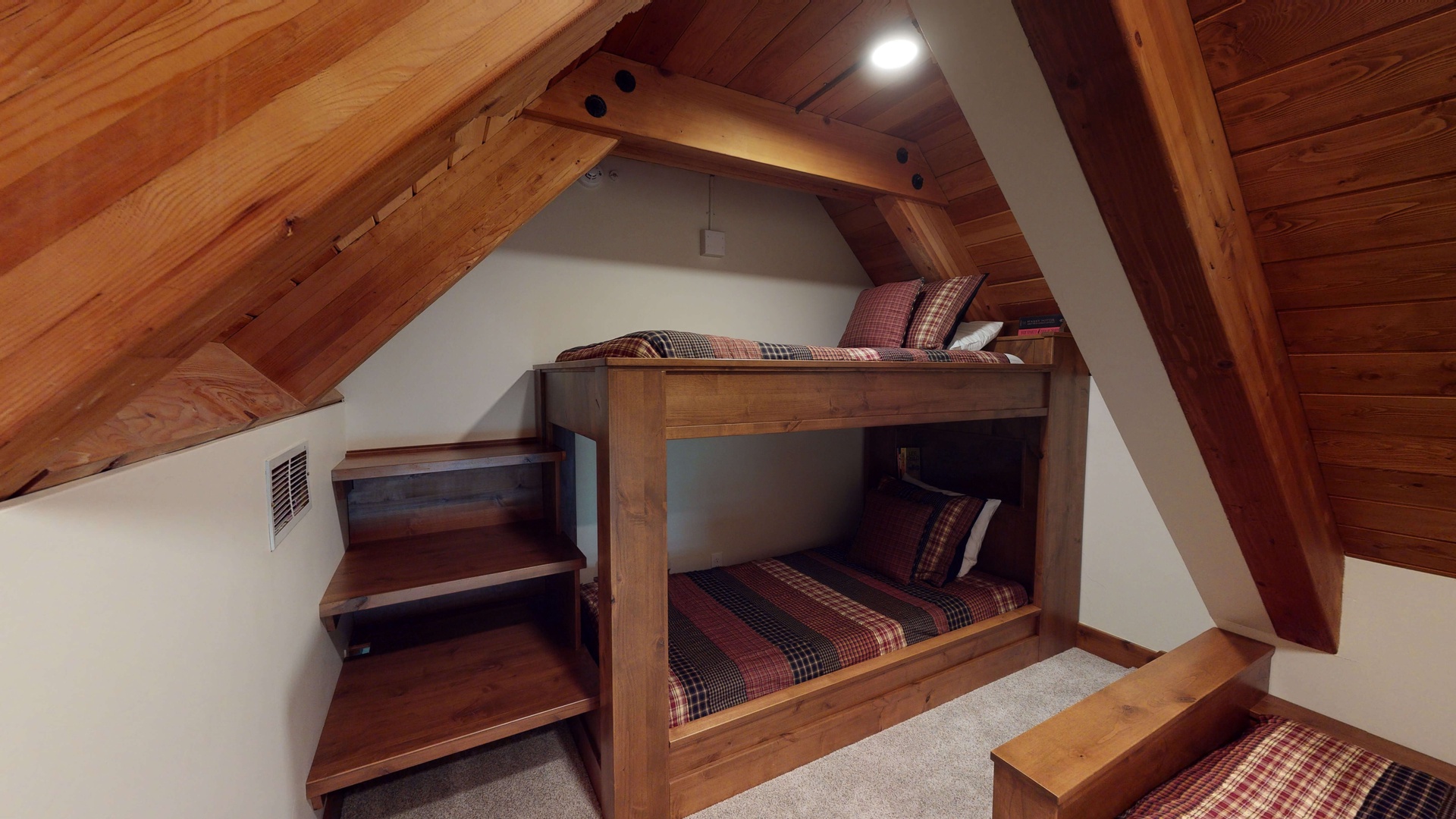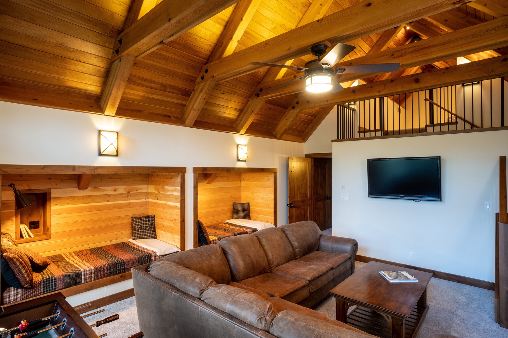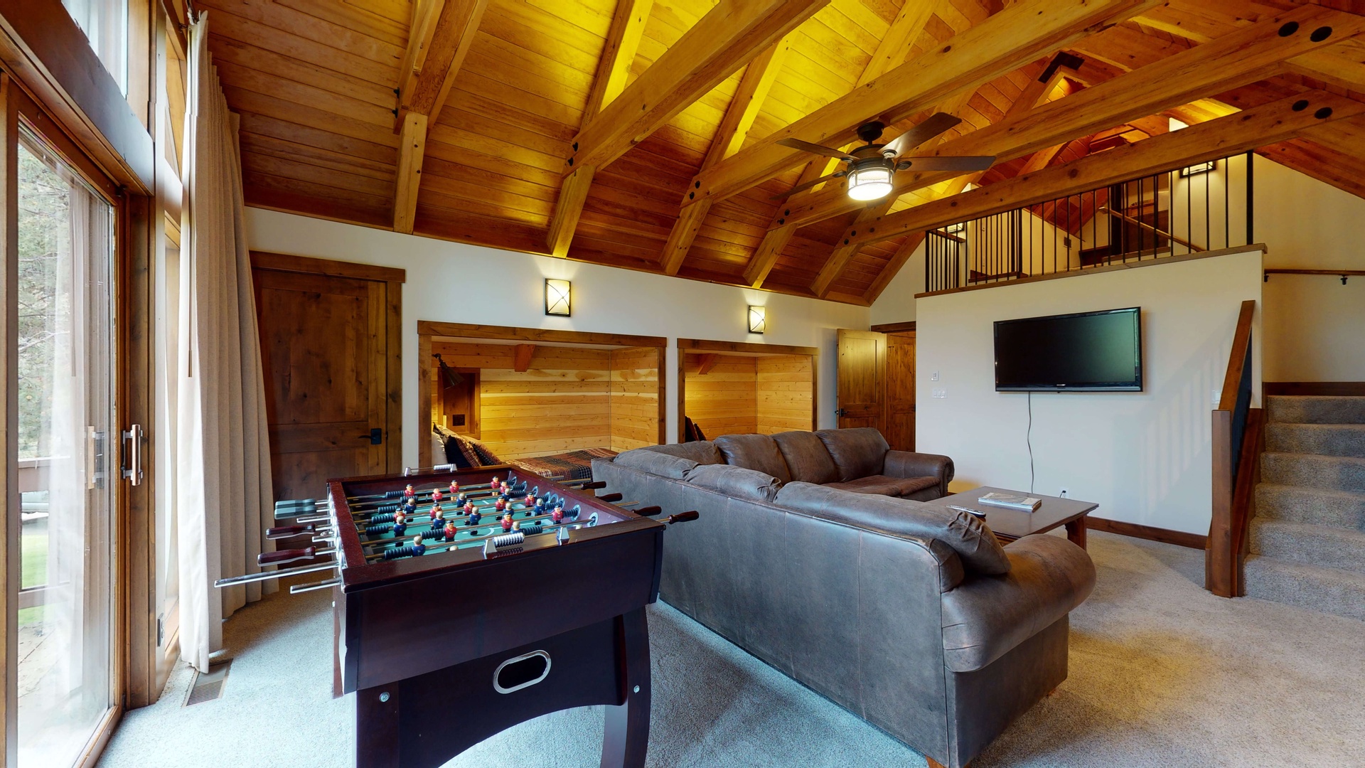 • Children will find plenty of space to play and sleep in their own upstairs “bunk room” and sleeping loft, complete with entertainment area, Foosball table, 6 built-in bunk beds, and adjacent bathroom