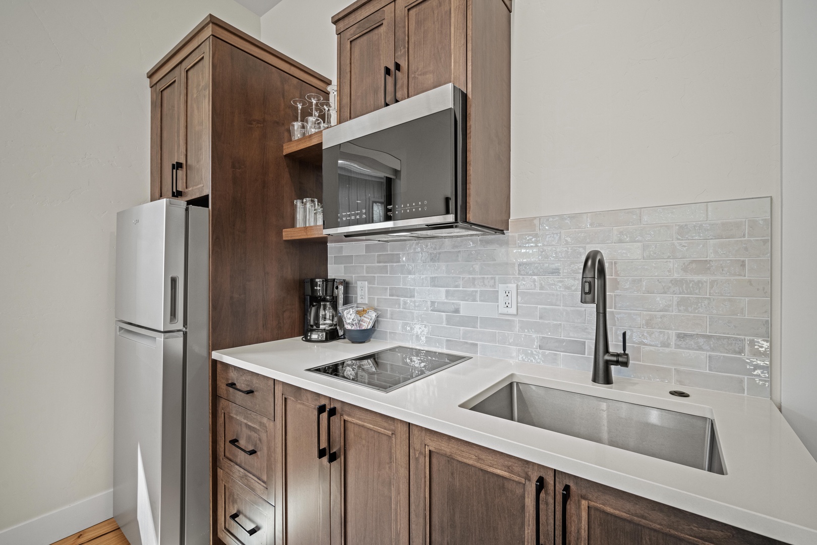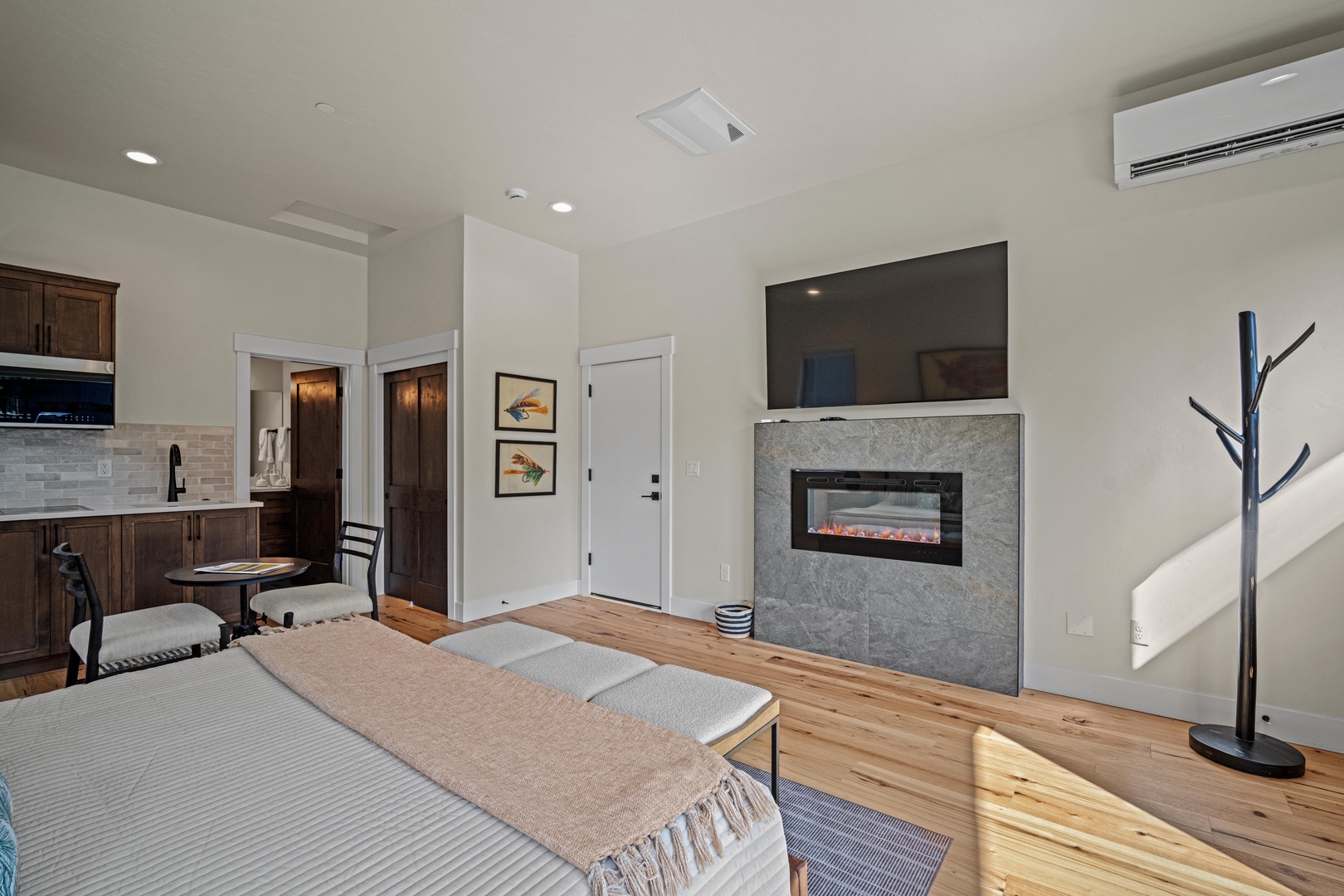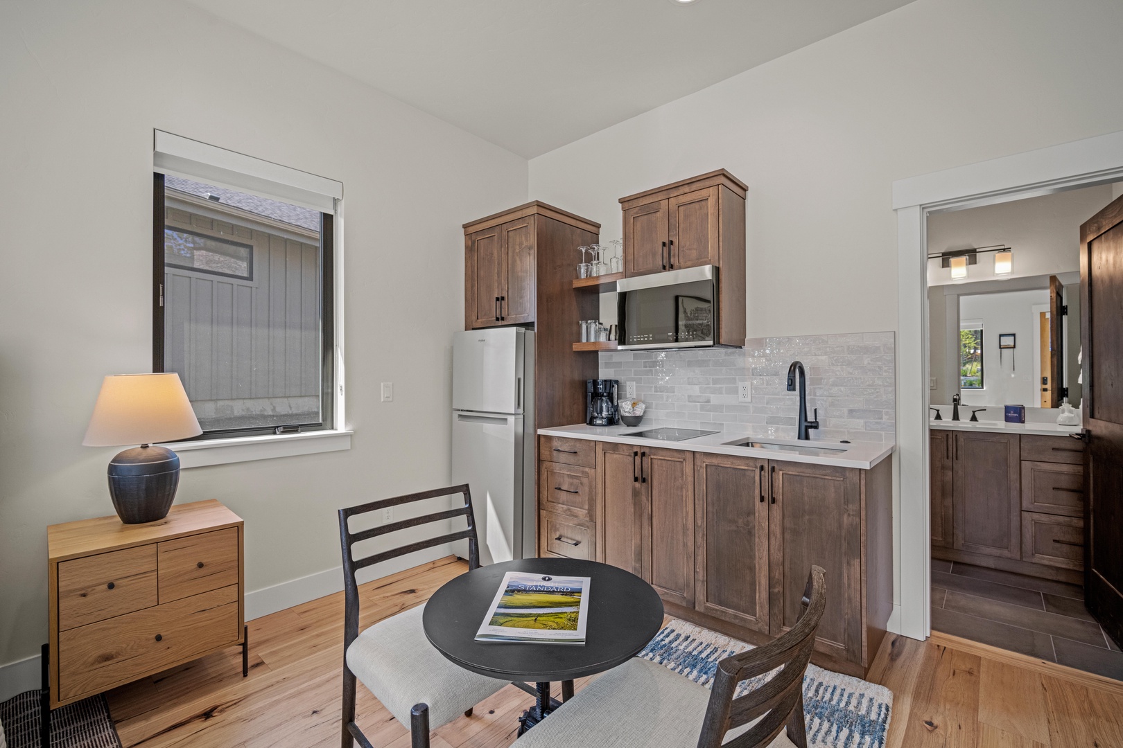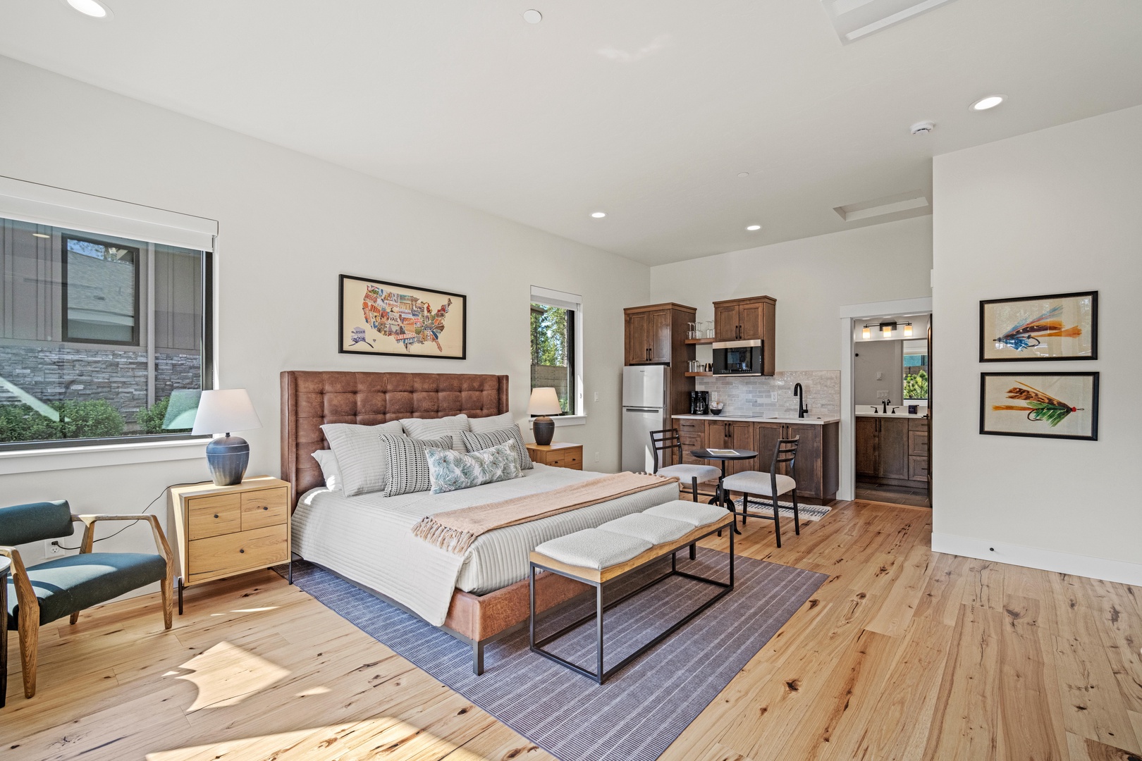 Make yourself at home with an upscale kitchenette equipped with stainless steel JennAir appliances as well as SMEG countertop appliances. A dining table that seats up to two; a separate living area with an electric fireplace, flat-screen TV , and high-end touches throughout. This studio includes one designated parking spot in the driveway. Overflow parking can be found at the Lake House parking lot, just a few minutes away. Forestbrook homes are located just moments from exclusive amenities, including the Lake House and Quarry Pool, Caldera Links golf course, community parks, tennis and pickleball courts, and an abundance of lakes, streams and trails.