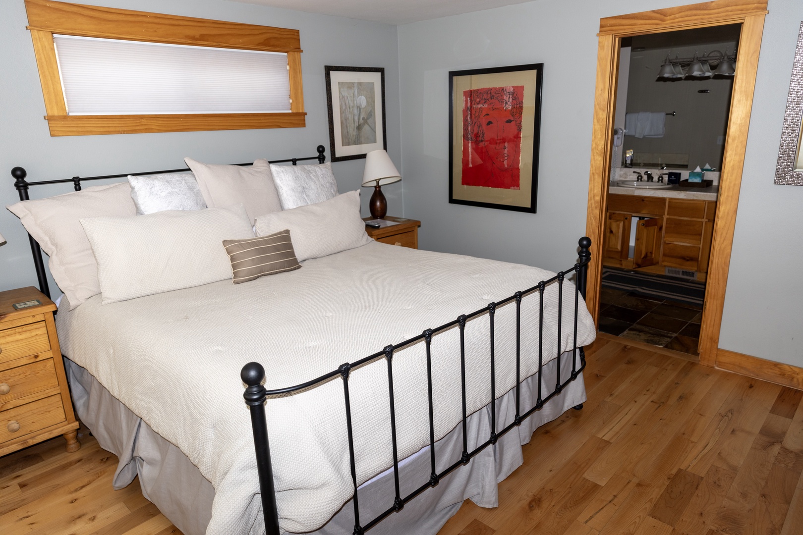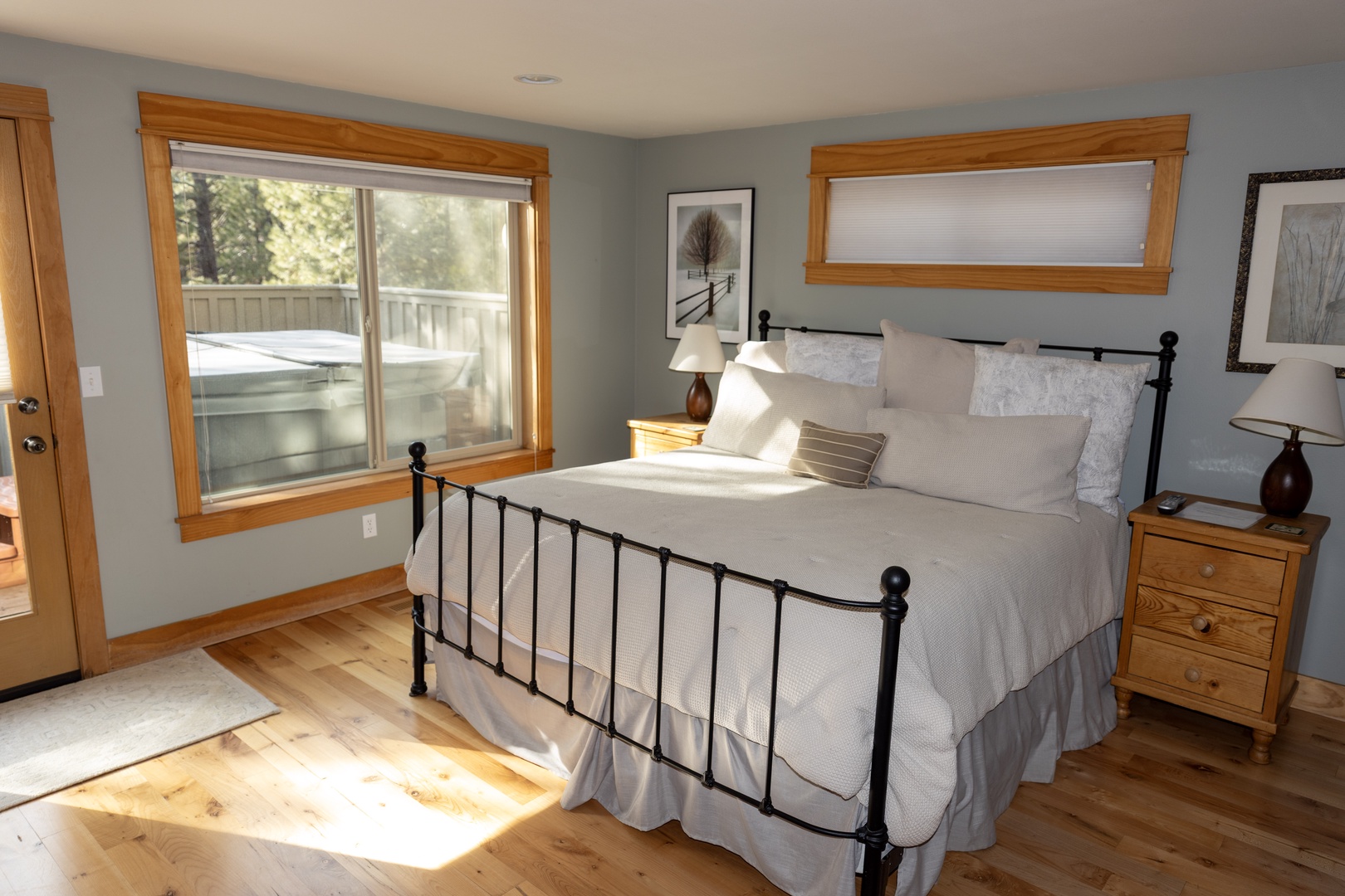 • Downstairs master bedroom featuring a king bed, TV, attached bathroom and private access to hot tub