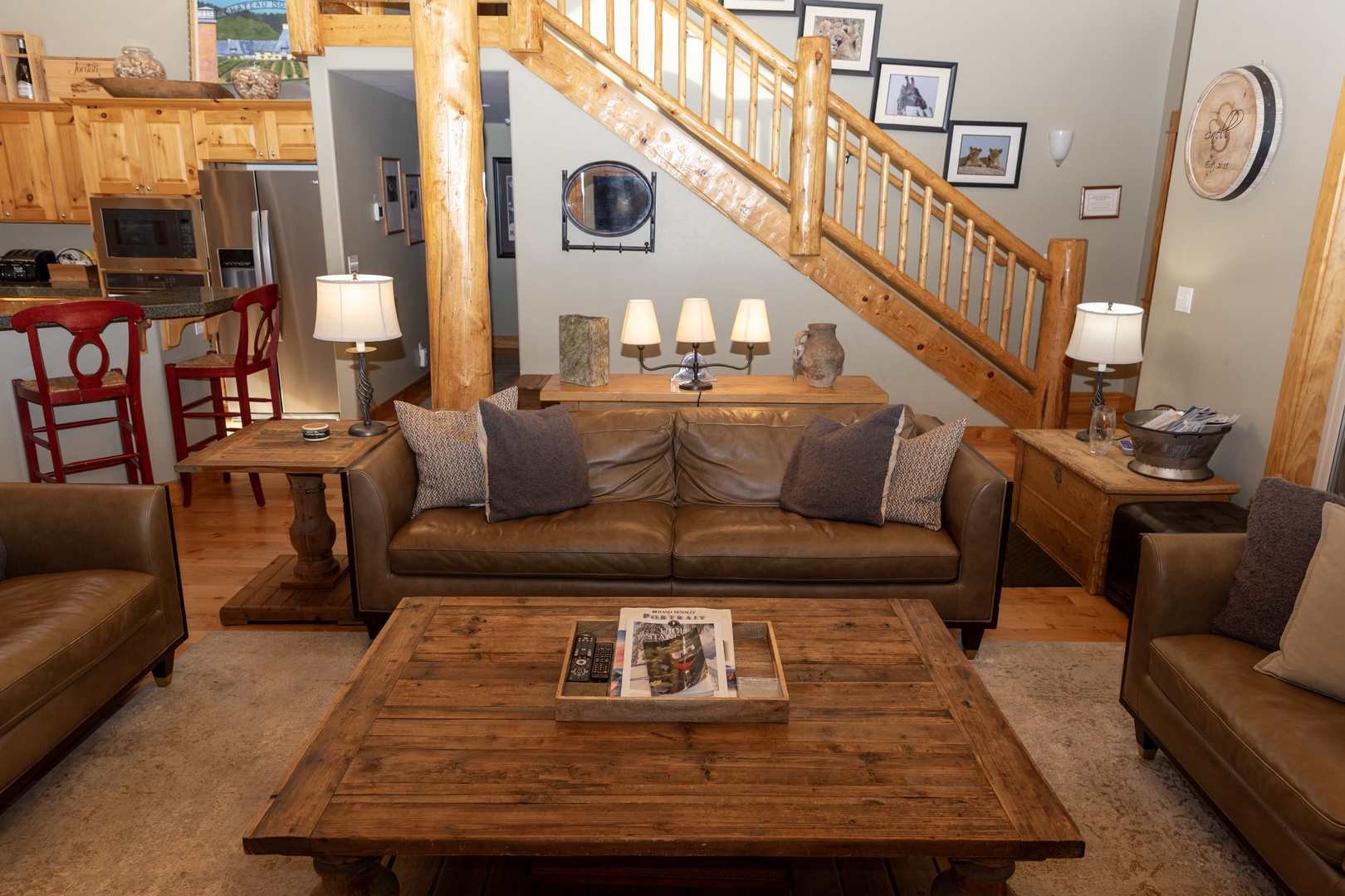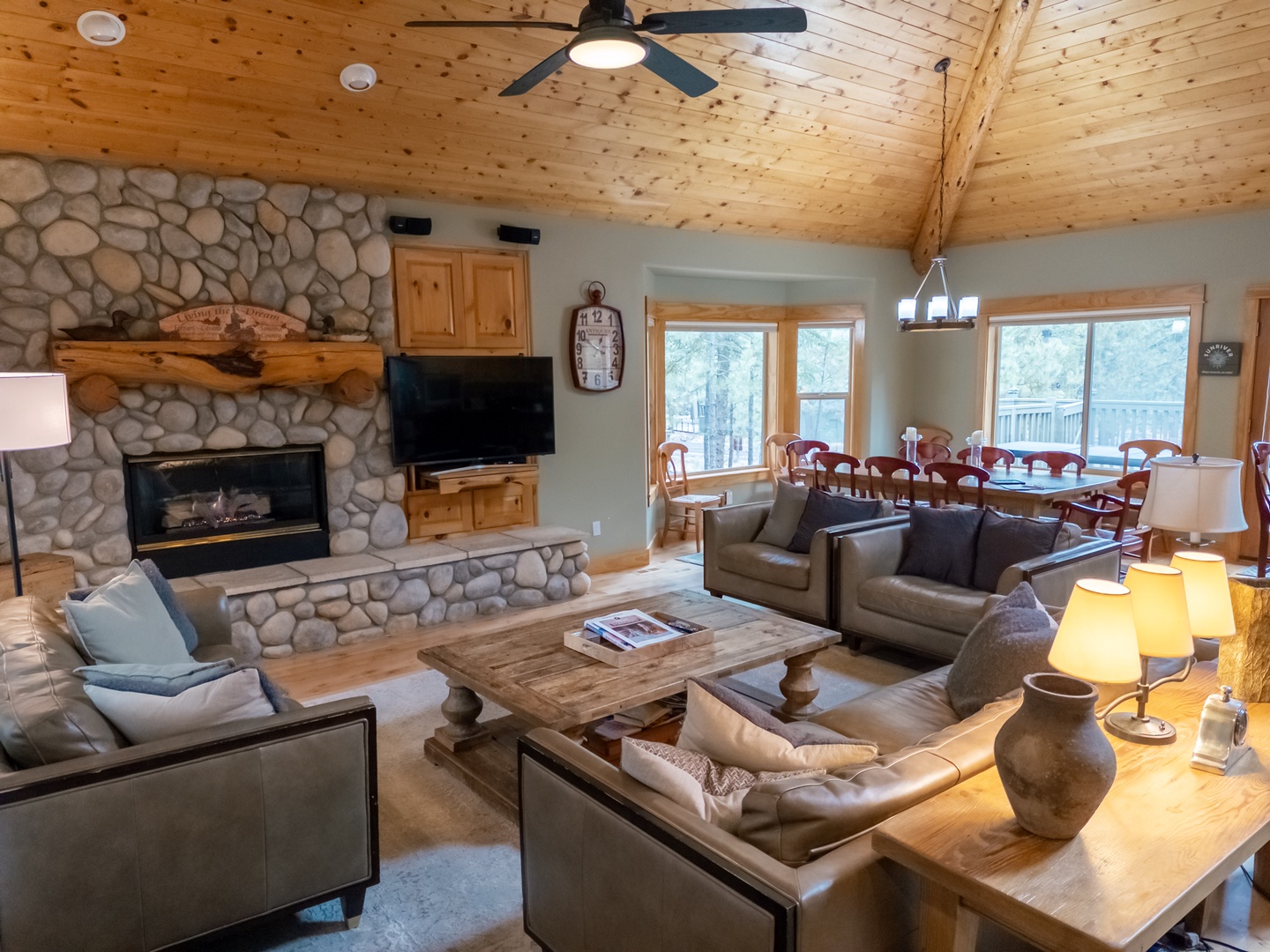 • Living room with ample seating, TV and a large river stone gas fireplace for the perfect blend of cozy and convenient