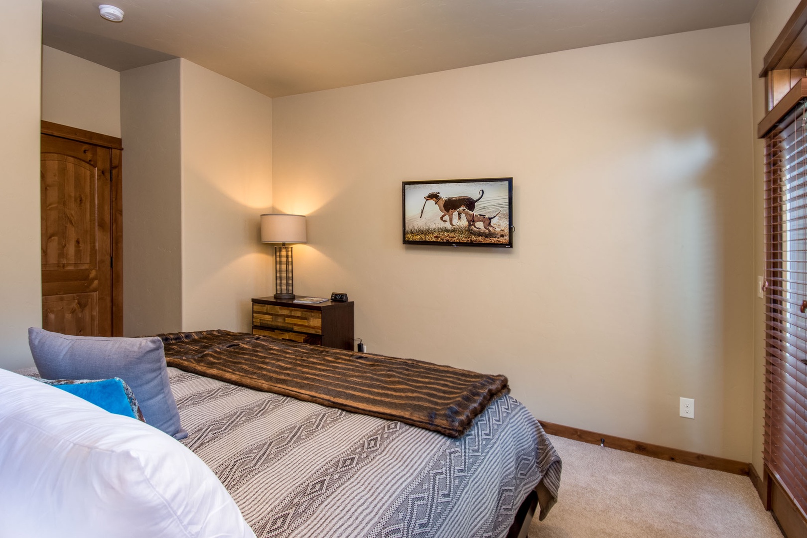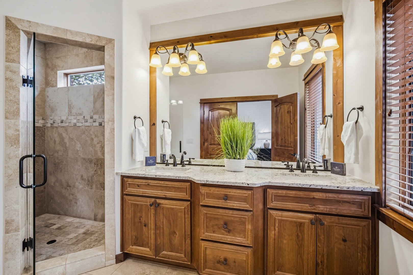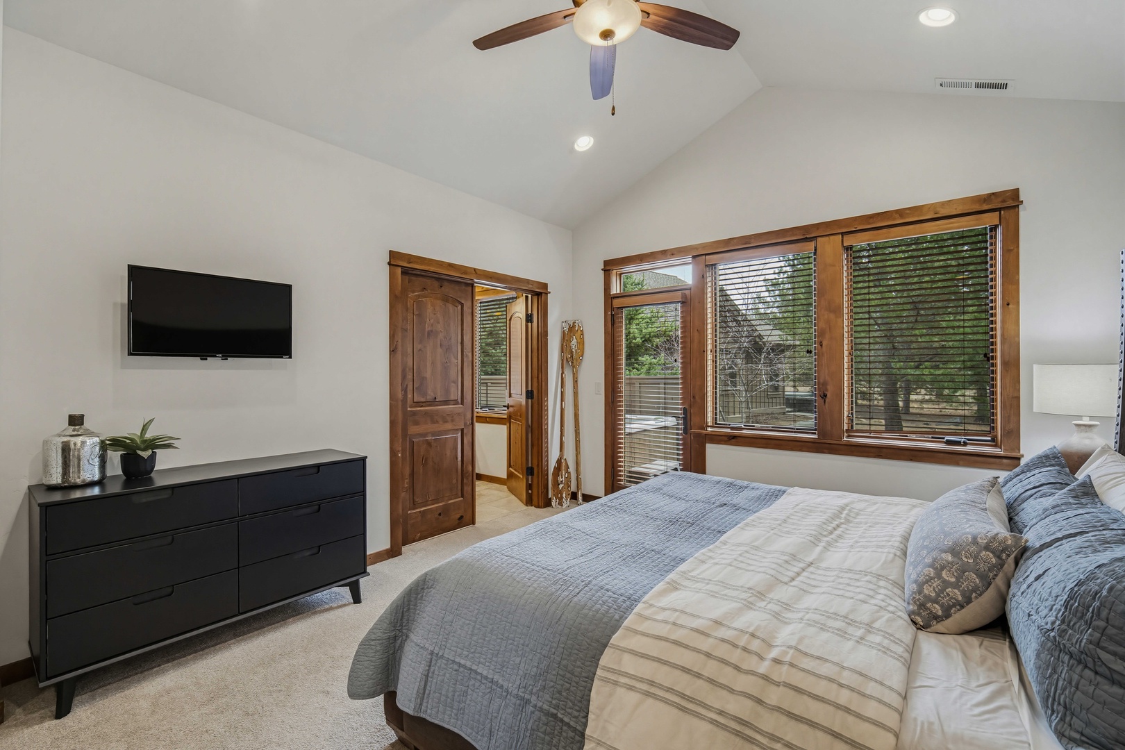 • Master king suite with TV, and a private entry to the hot tub and attached bathroom with tile shower, soaking tub, and double sinks