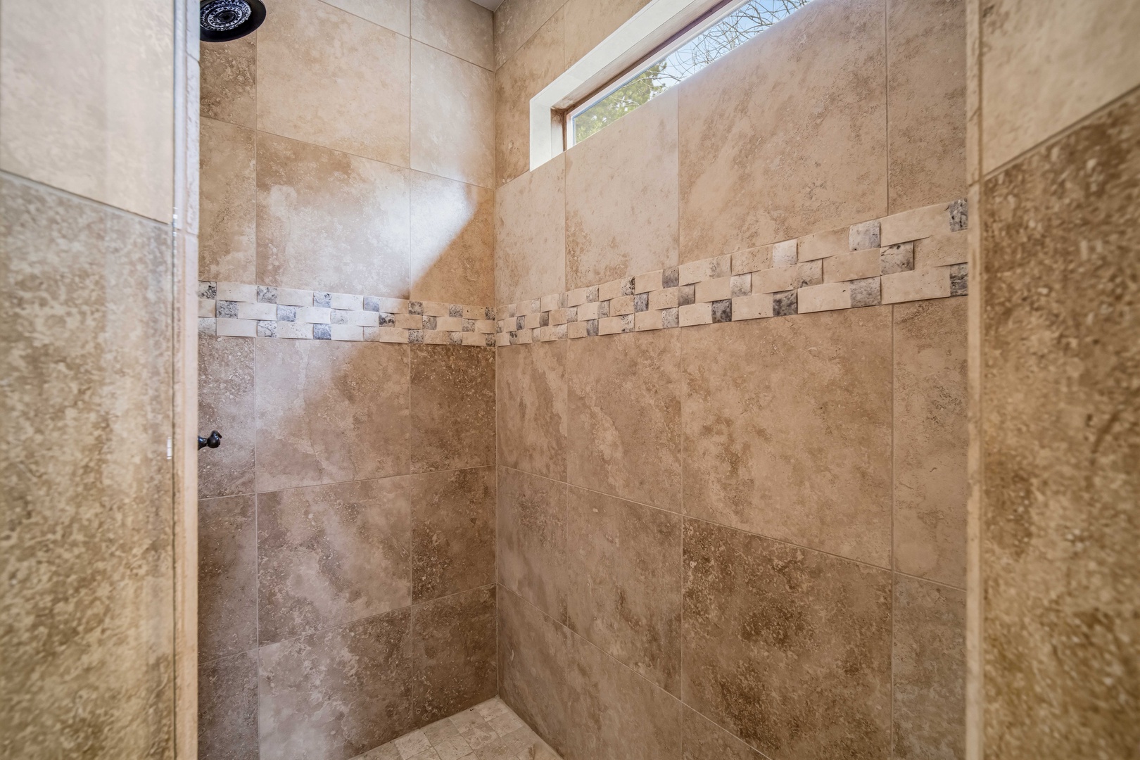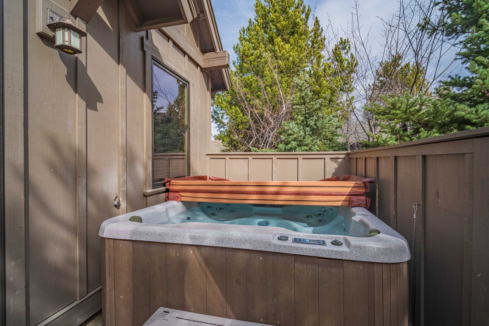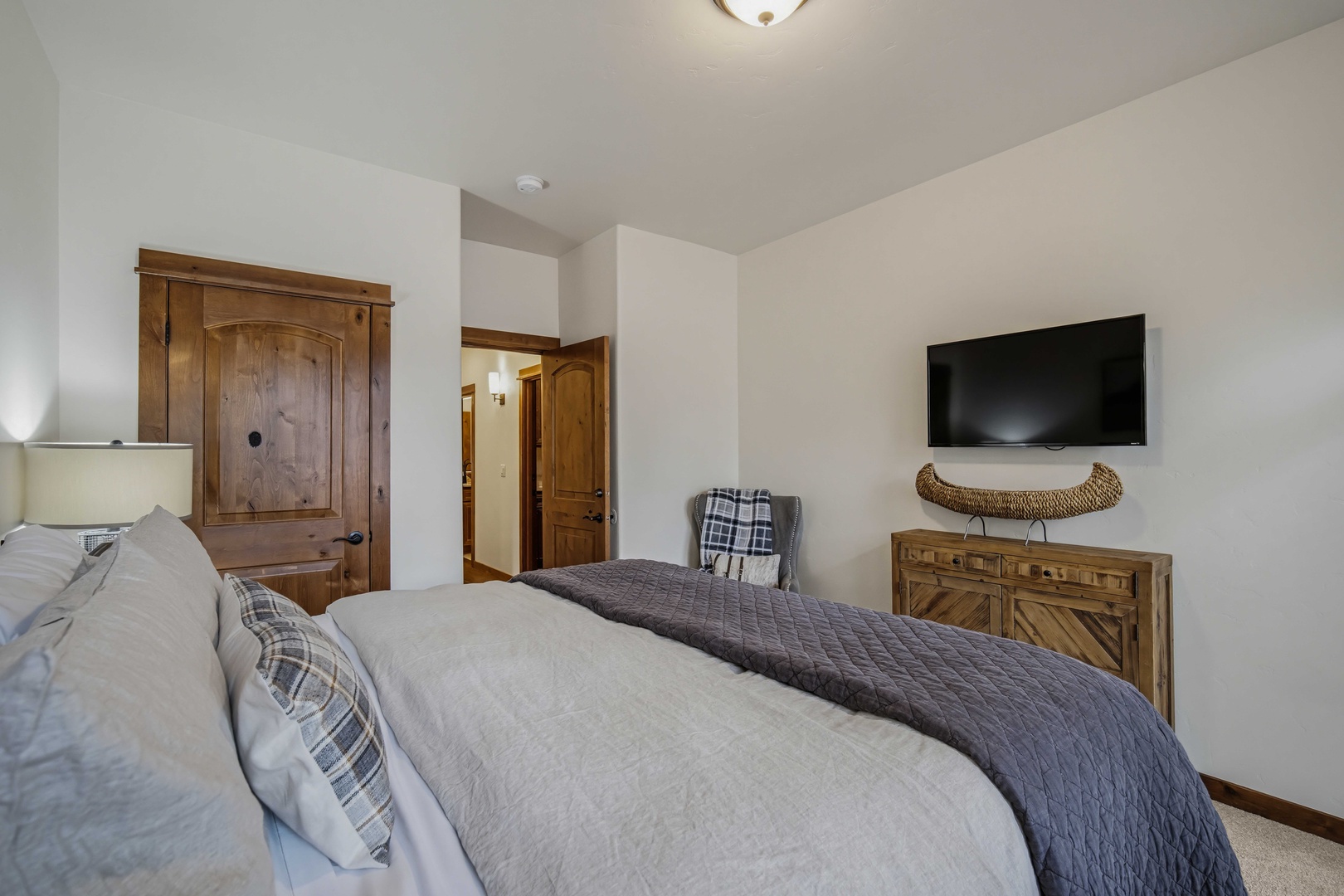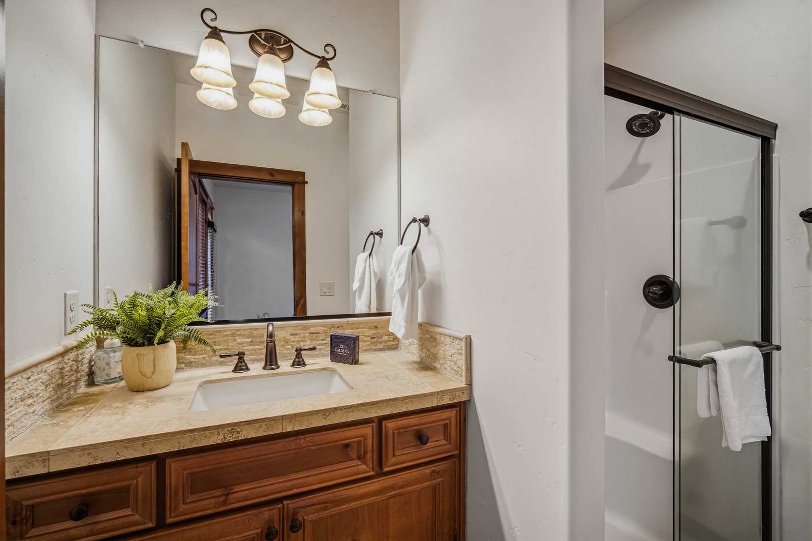 • Master king suite with TV, and a private entry to the hot tub and attached bathroom with tile shower, soaking tub, and double sinks