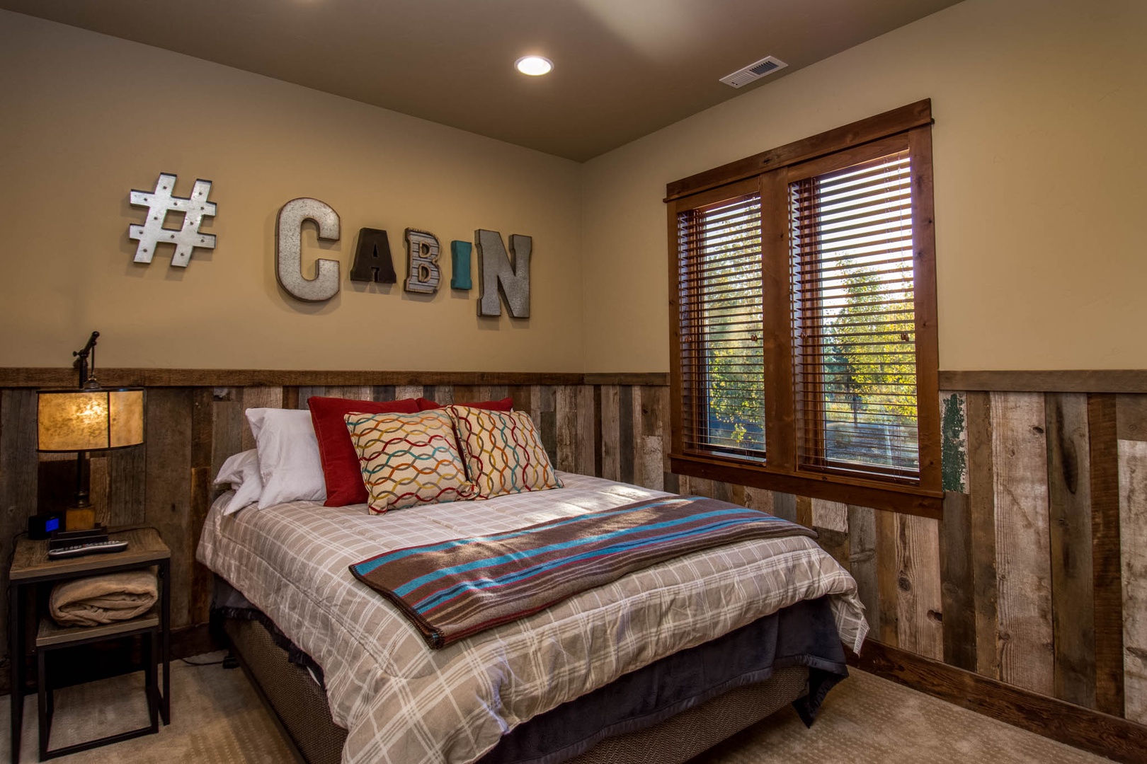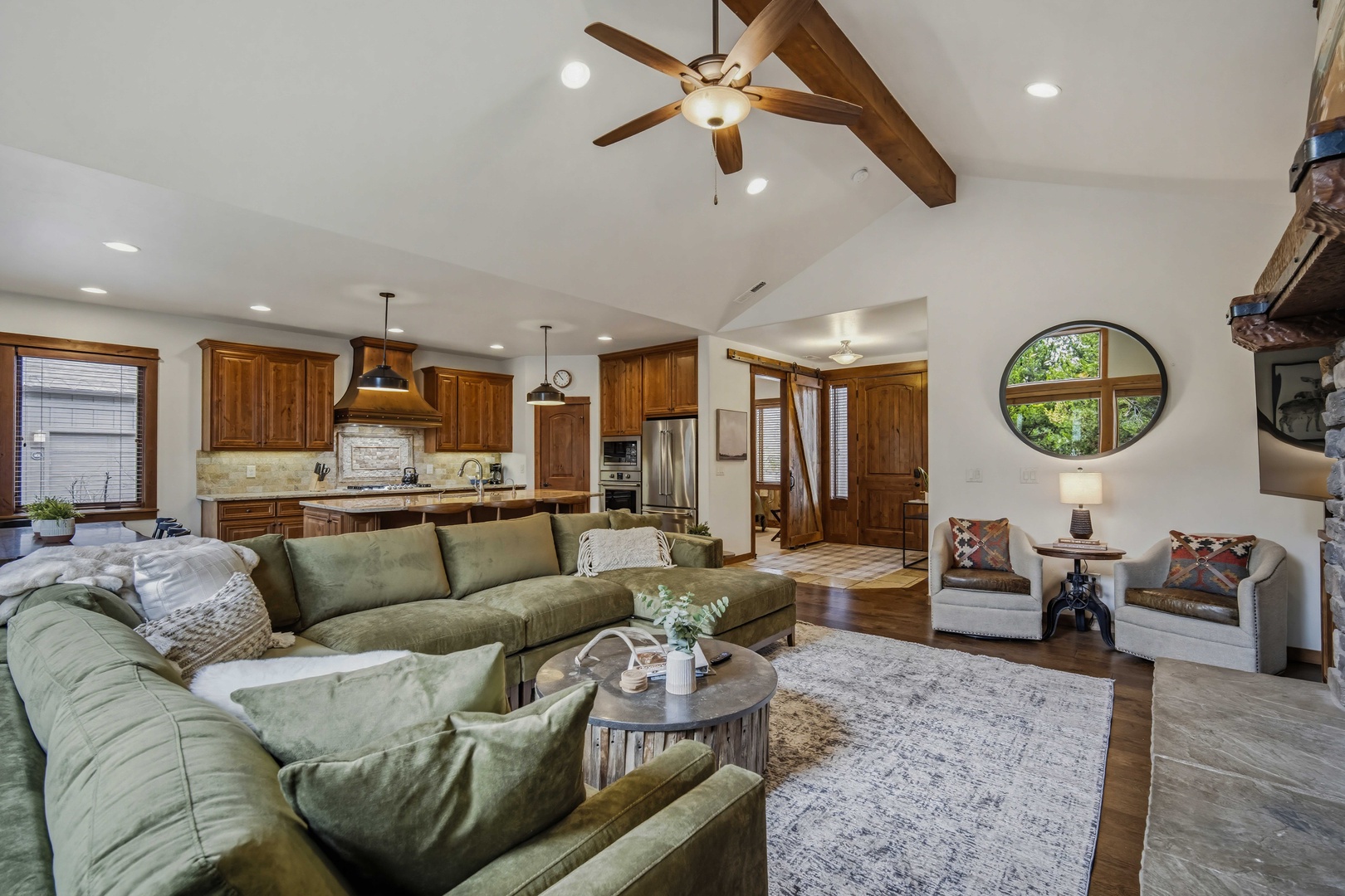 Inside this well-appointed two-story cabin, guests will enjoy open kitchen, updated living, and dining spaces filled with natural light from large windows, complemented by hardwood floors, vaulted ceilings, and warm wood accents throughout.