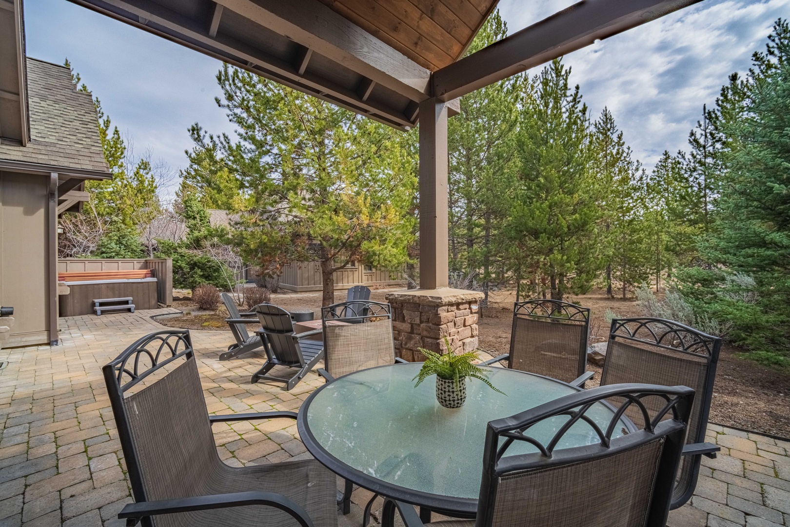 • Back patio featuring forest views, hot tub, barbecue, and covered dining area