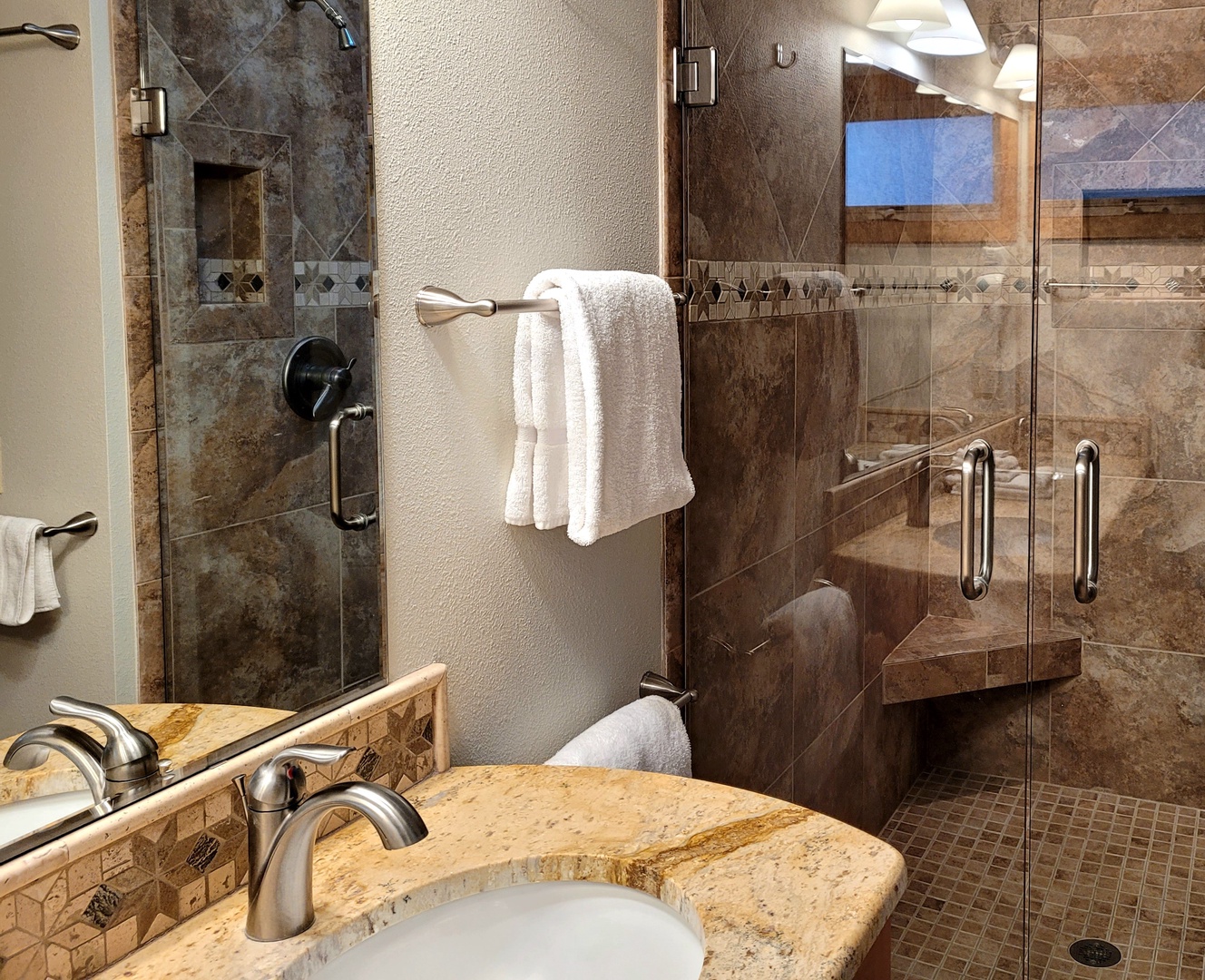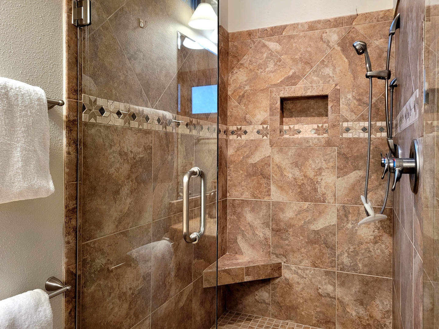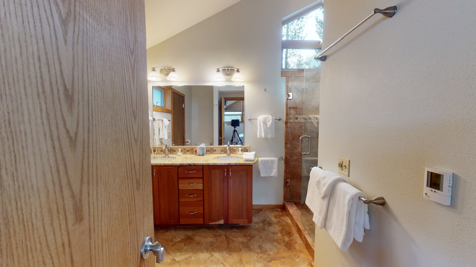 • Master suite upstairs with a king bed, flat screen TV with an attached dual sink bathroom, large walk-in shower and access to the outside patio and hot tub