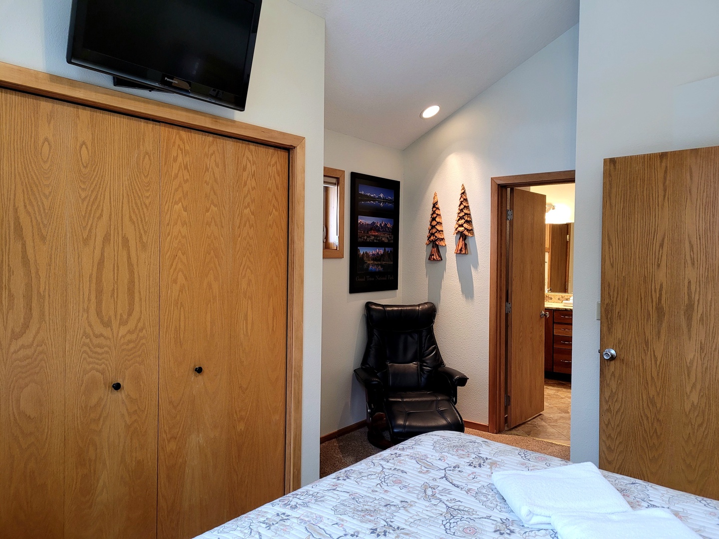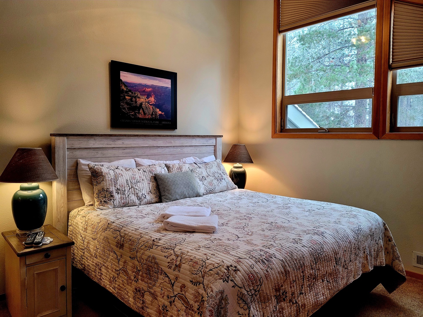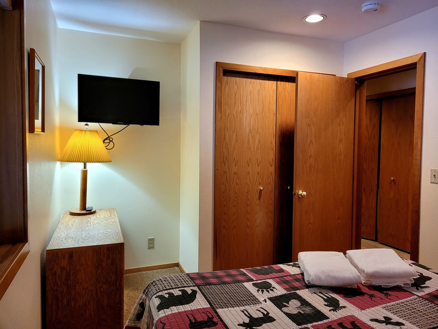 • A downstairs bedroom with a queen bed and a flat screen tv