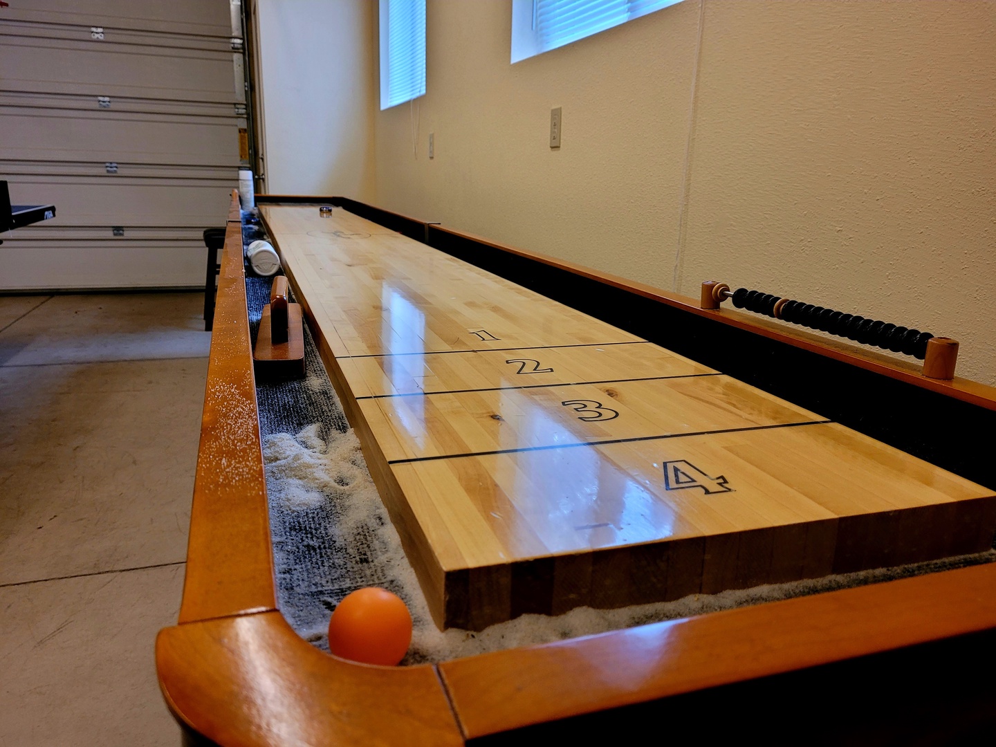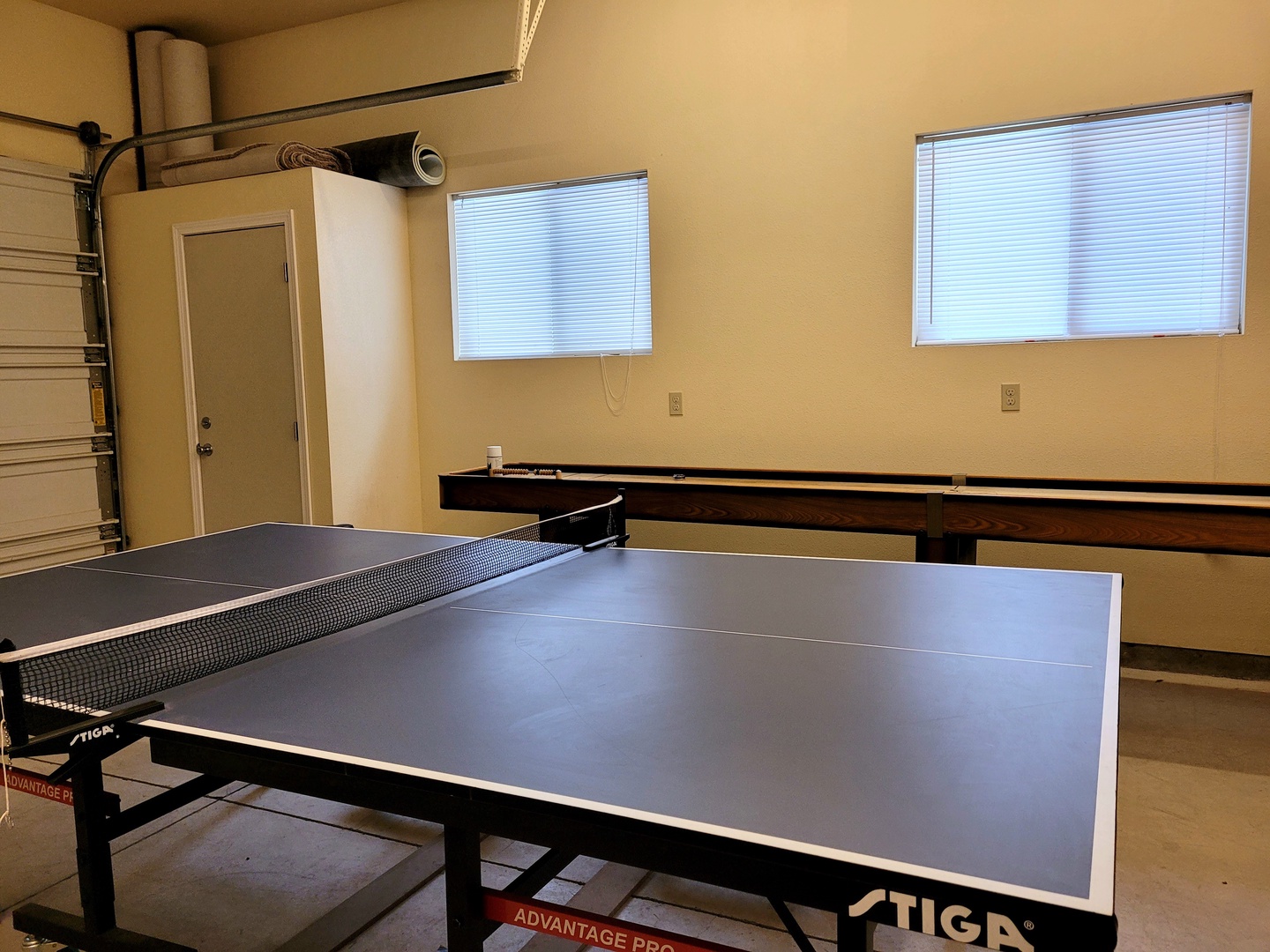 • A large garage with a ping pong table and a shuffleboard table with room to park 1 car.