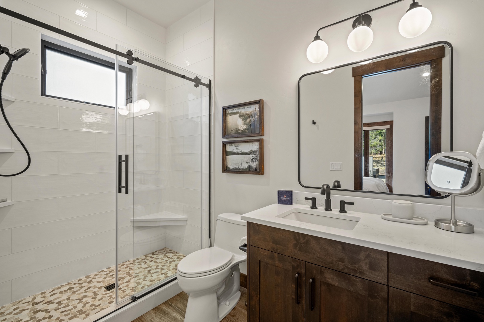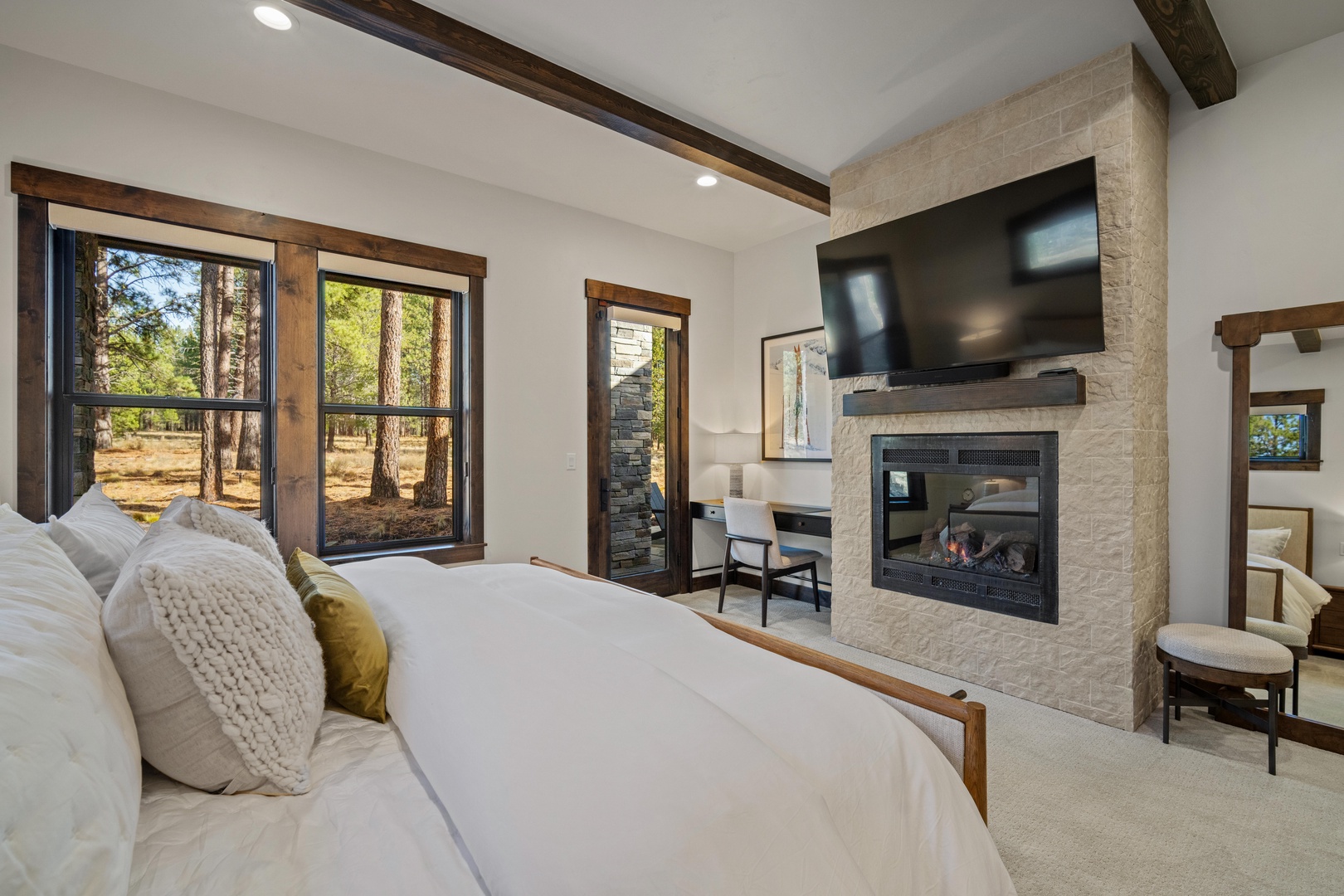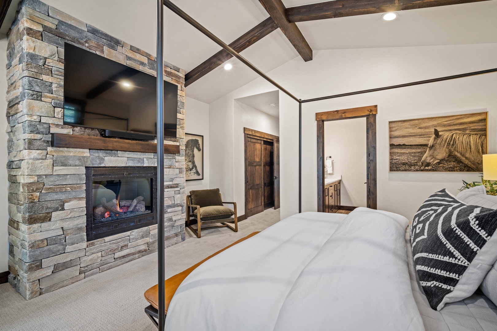 • A spacious primary king suite with a TV, gas fireplace, and an attached bathroom with a walk-in tile shower