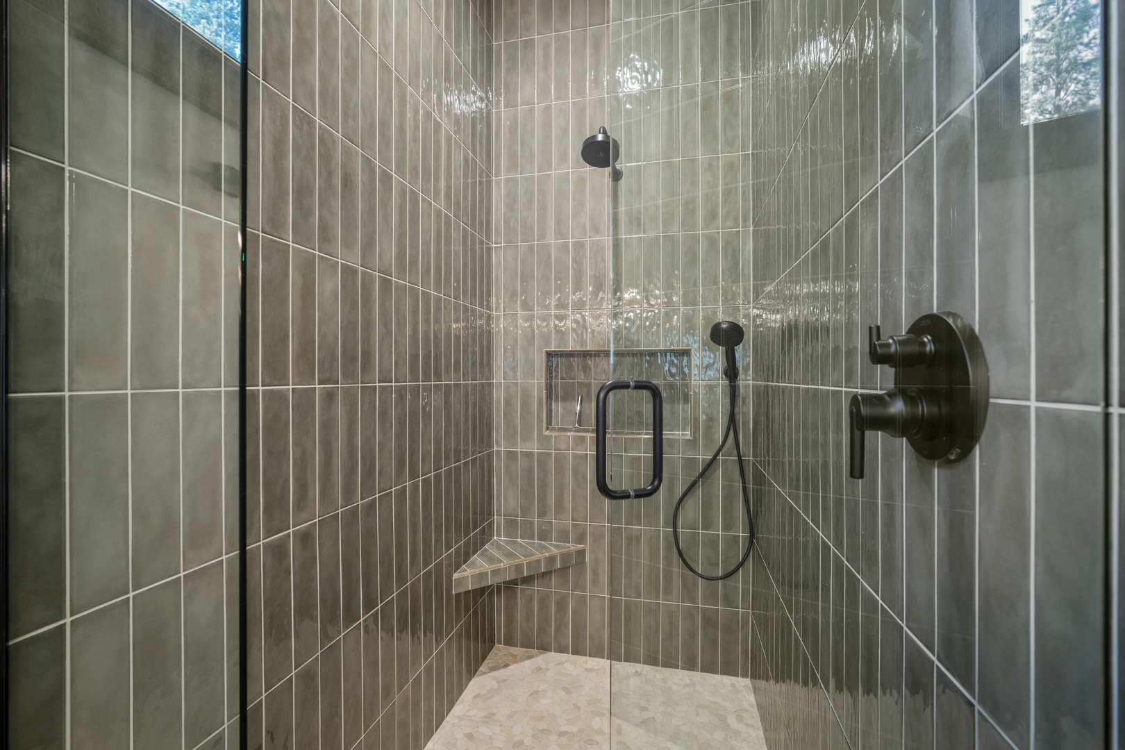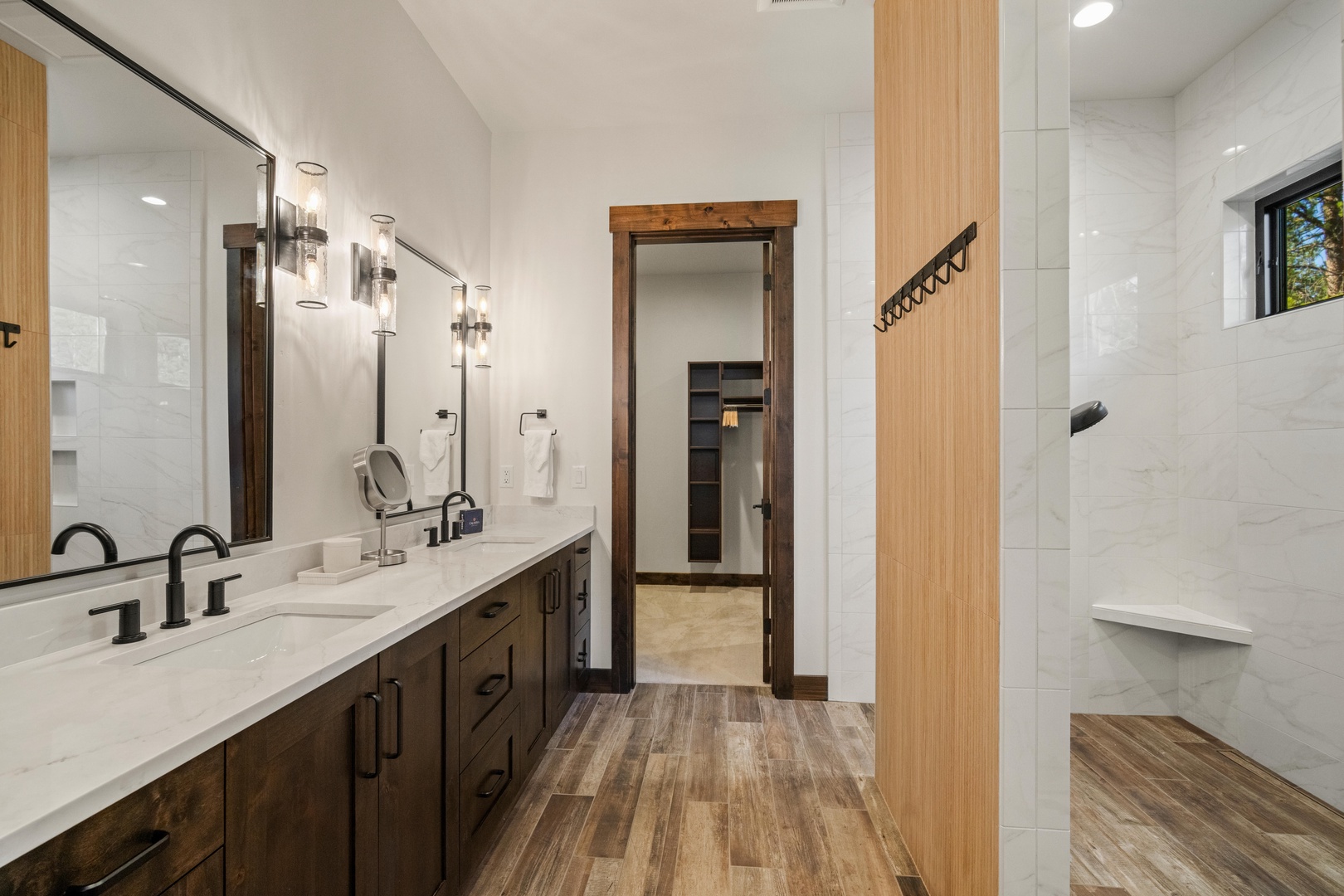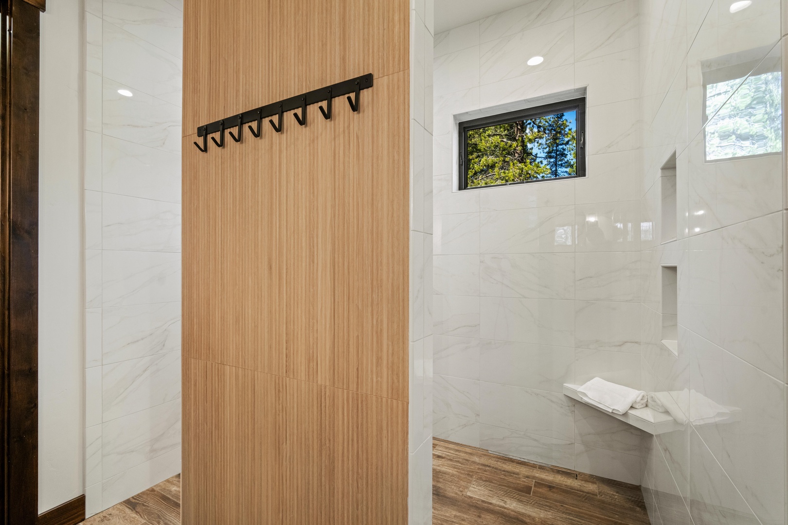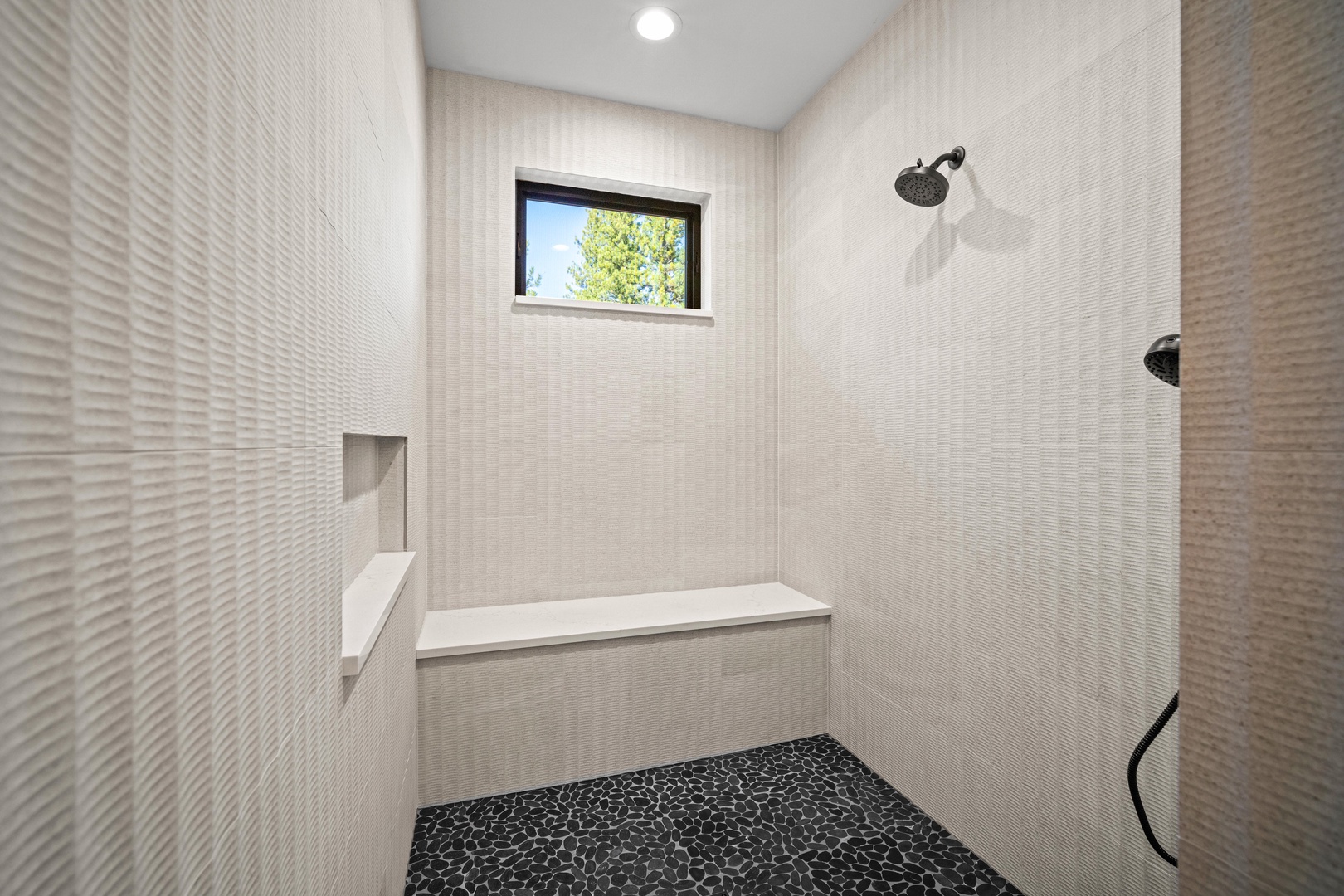 • A spacious primary king suite with a TV, gas fireplace, and an attached bathroom with a walk-in tile shower