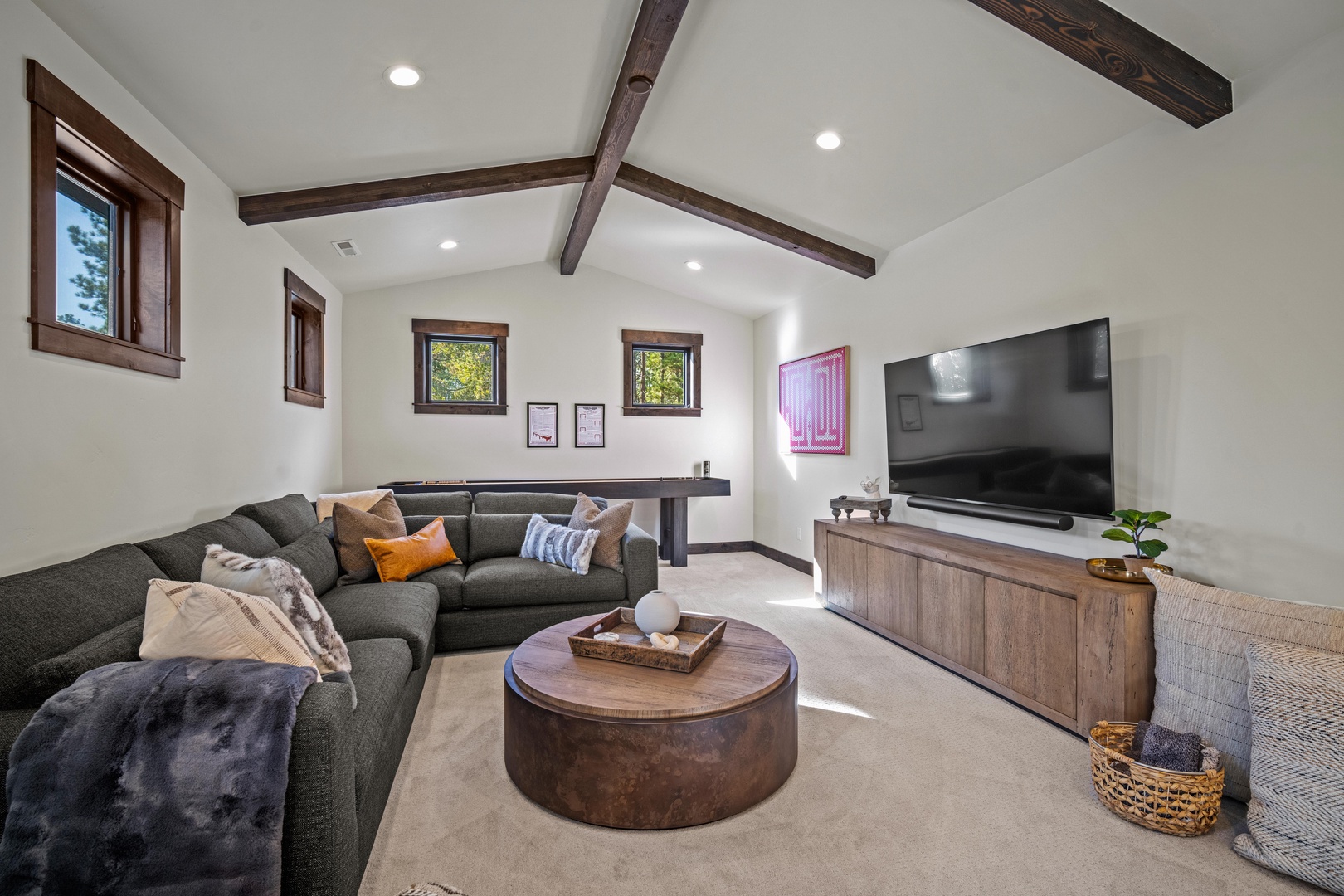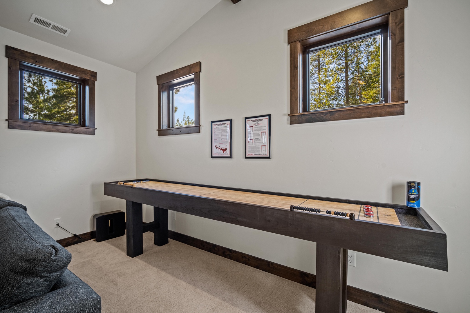• An upstairs bonus room with a large TV, and a shuffleboard table