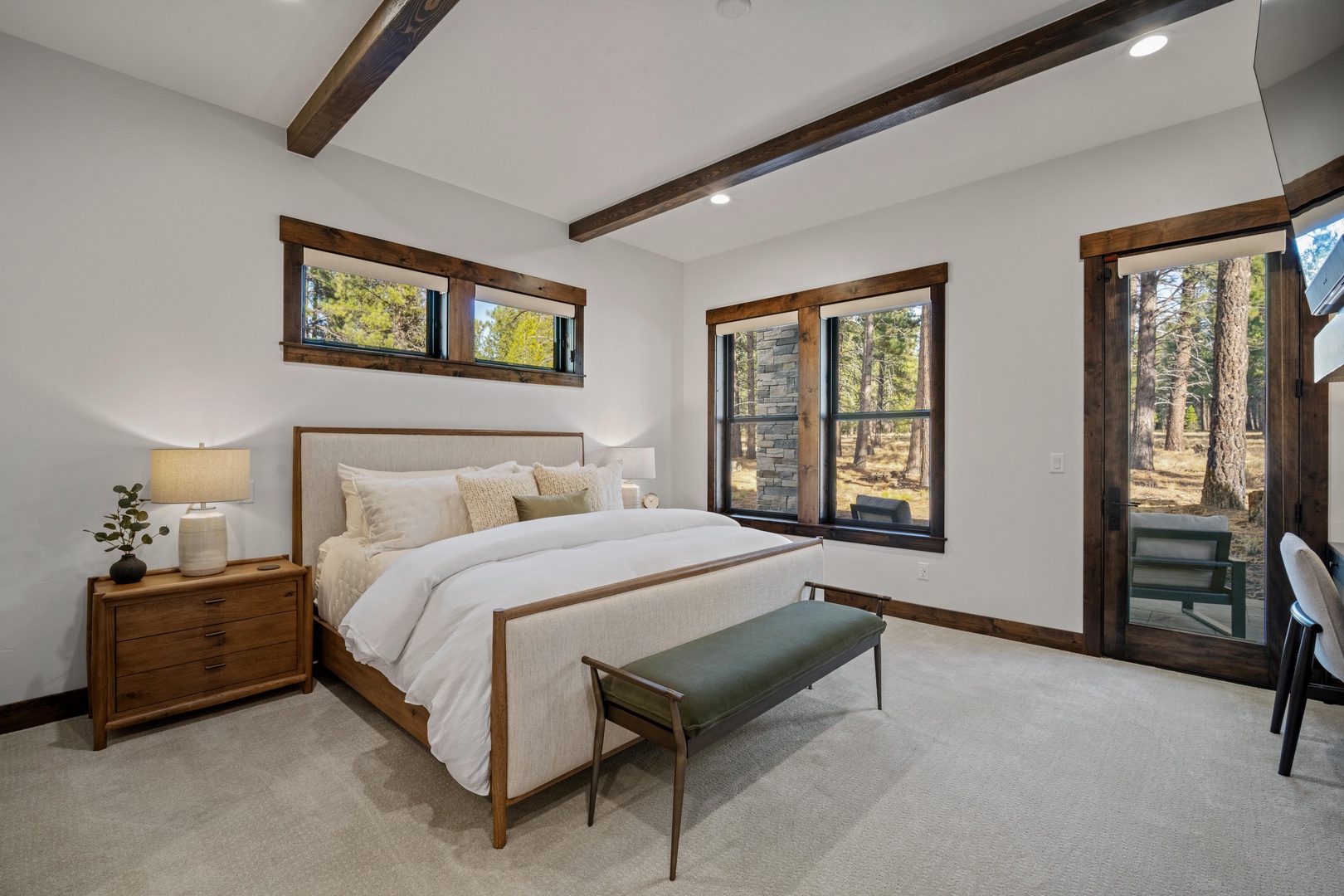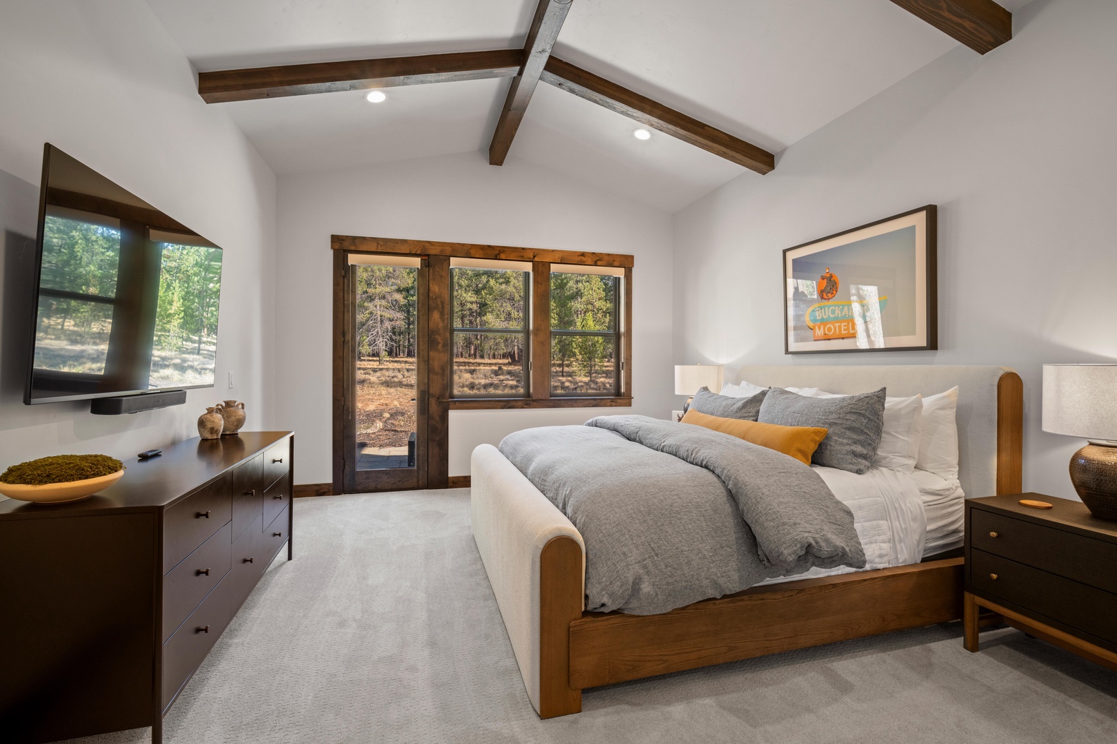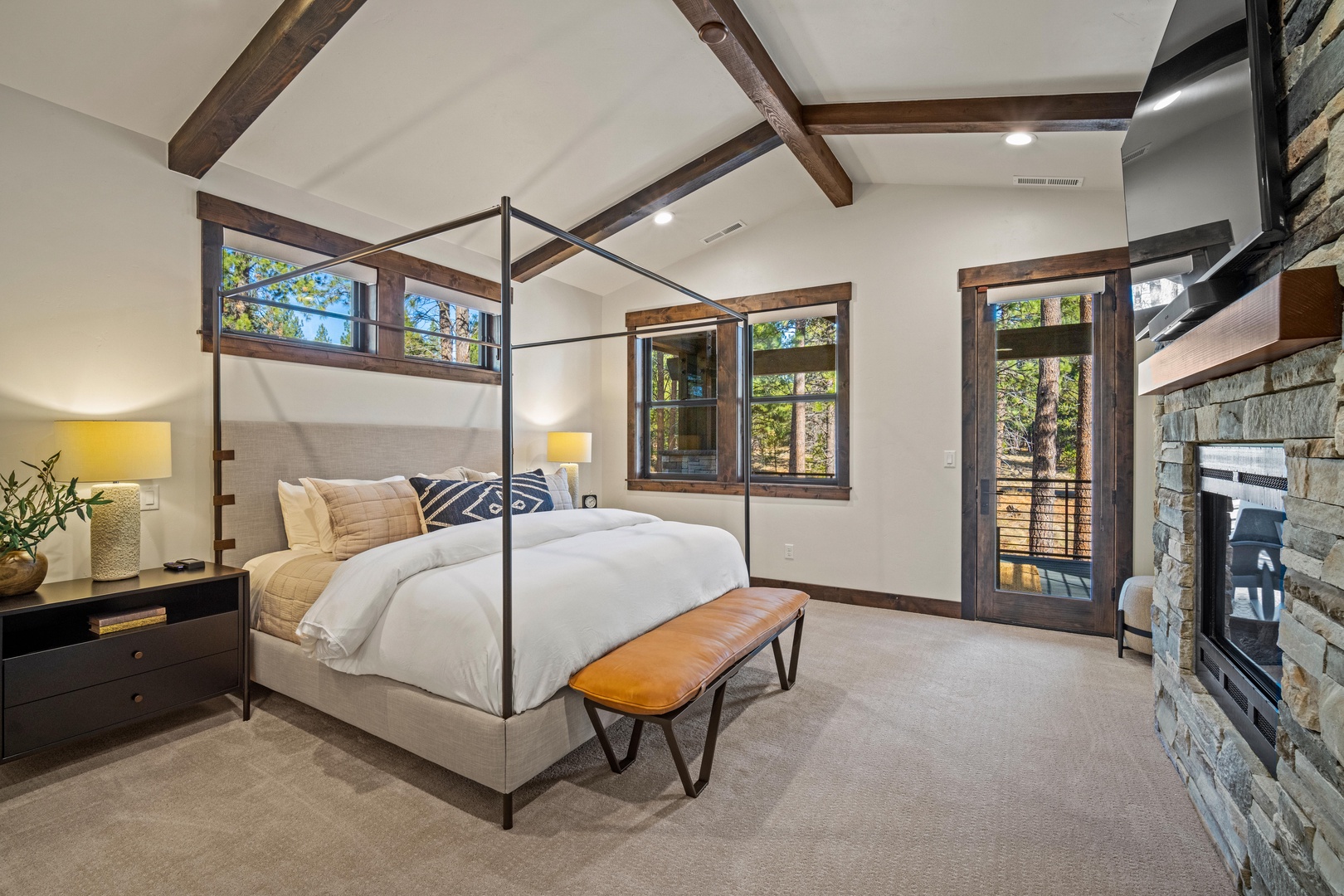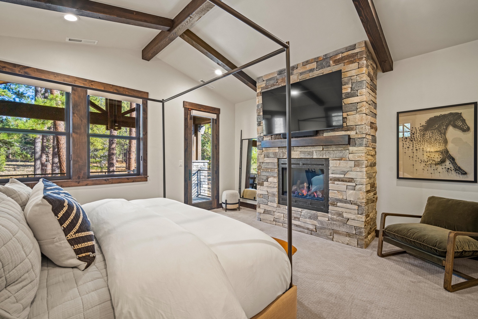 • An upstairs bedroom with a king bed, a TV, gas fireplace, private deck and an attached bathroom