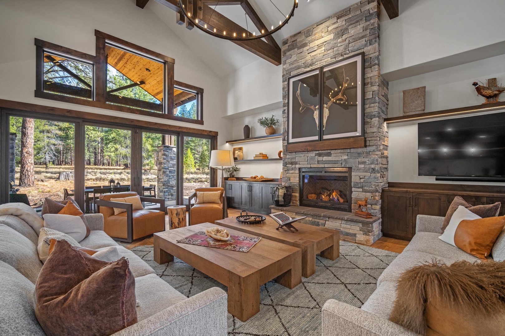 • A roomy living area featuring a large flat-screen TV and a gas fireplace for the perfect combination of cozy and convenient