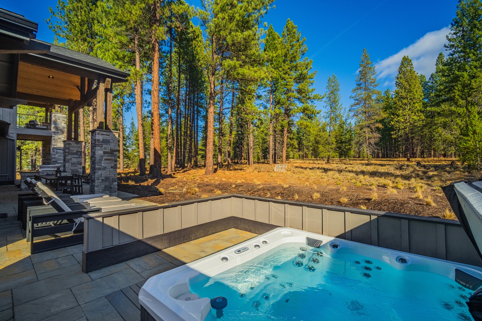 • A large outdoor patio with a hot tub, BBQ, patio furniture, and a fire pit