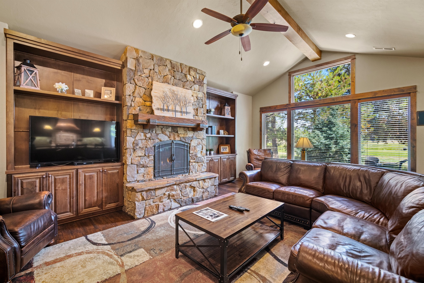 • Living room featuring comfortable seating, TV with DVD player and large gas fireplace for the perfect blend of cozy and convenient