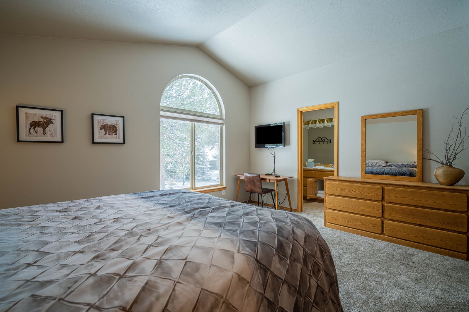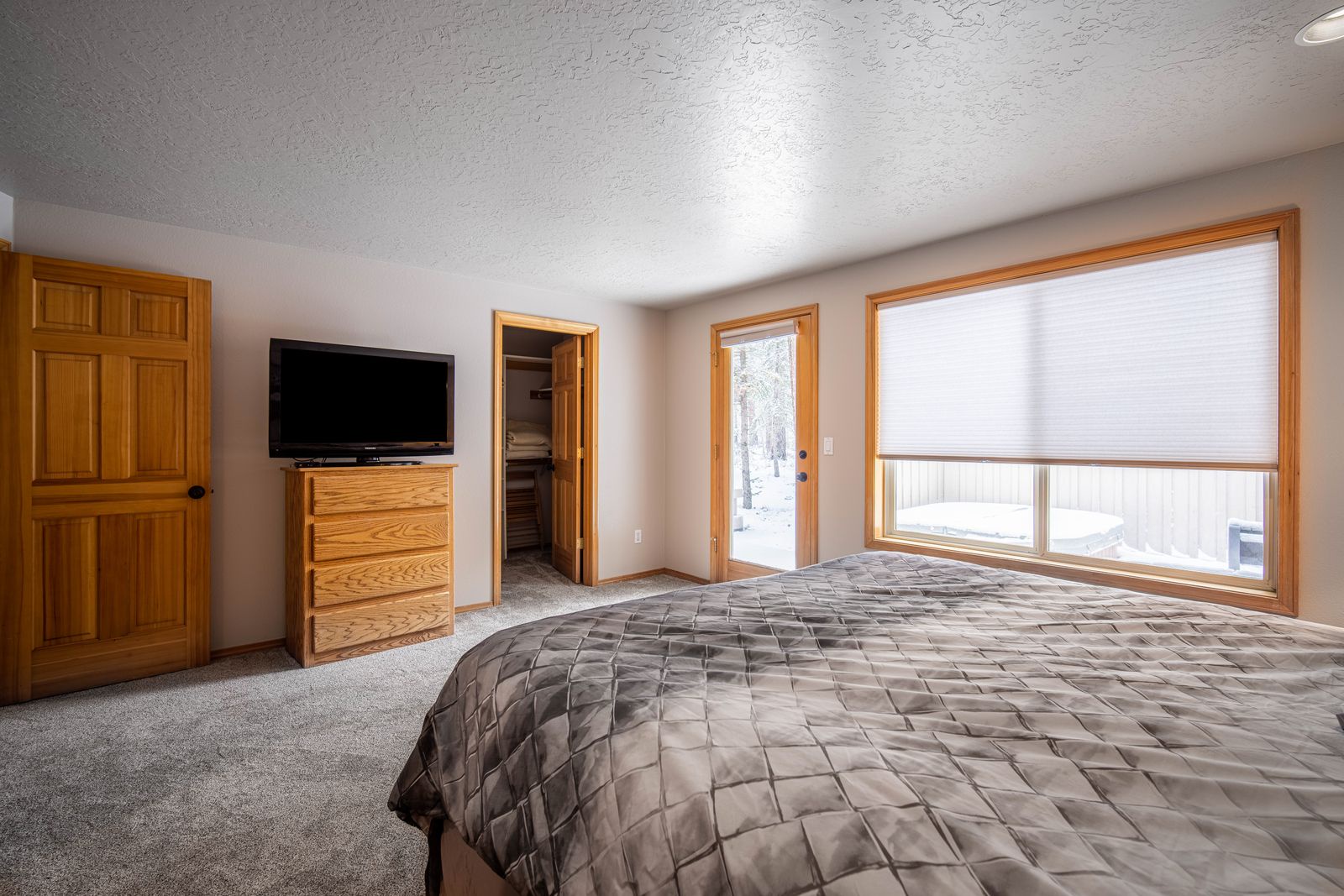 • Downstairs master bedroom featuring a King bed, TV, attached bathroom with soaking tub and private access to hot tub