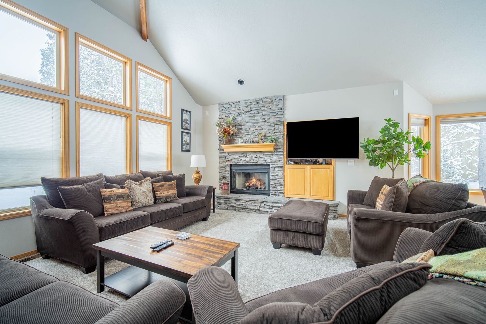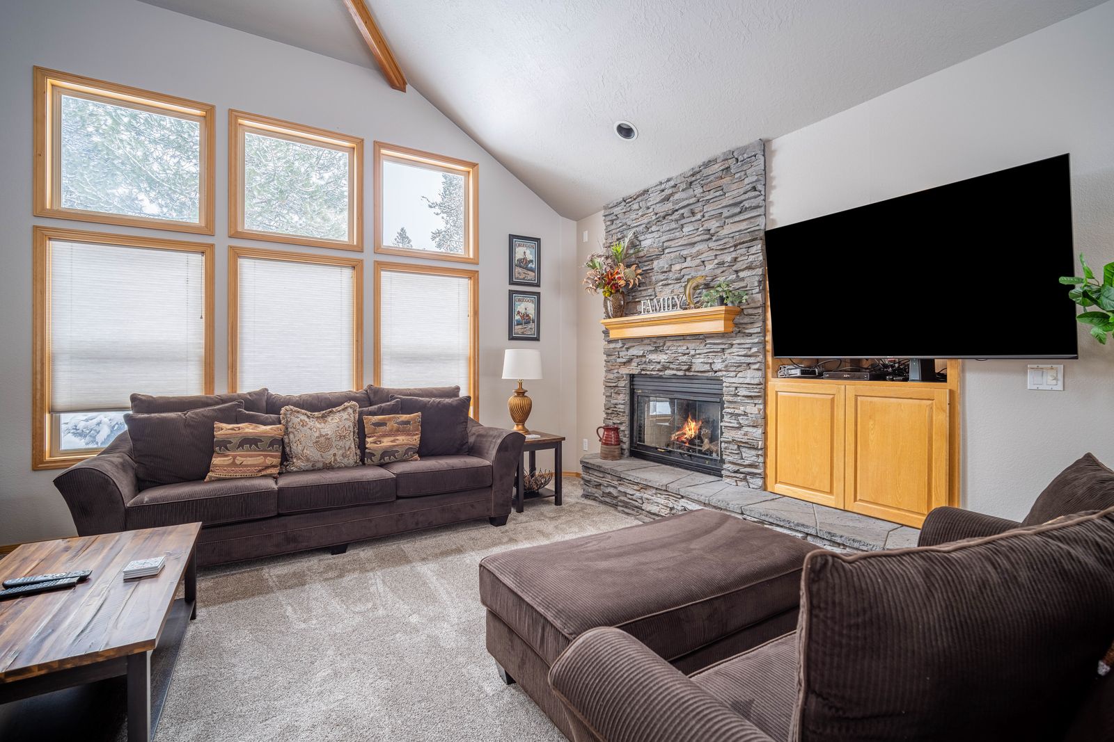 • Living room with ample seating, TV and a large stacked stone gas fireplace for the perfect blend of cozy and convenient