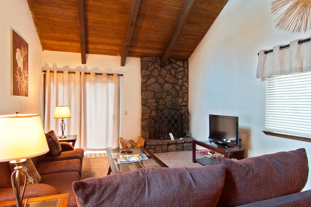• Comfortable living room with ample seating, TV, and wood burning fireplace