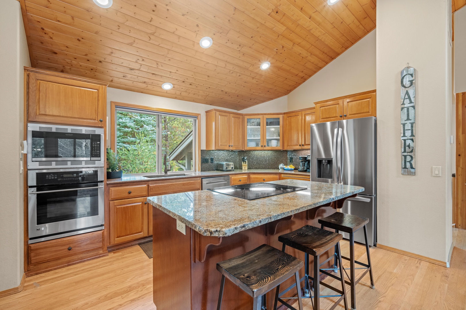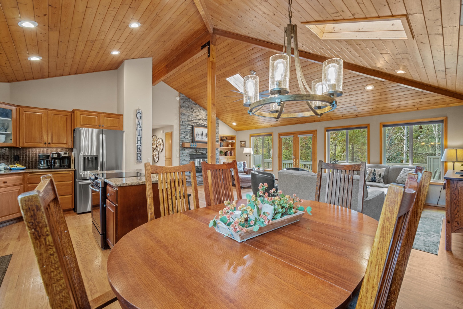 • An open kitchen with breakfast seating and a generously sized dining room table.