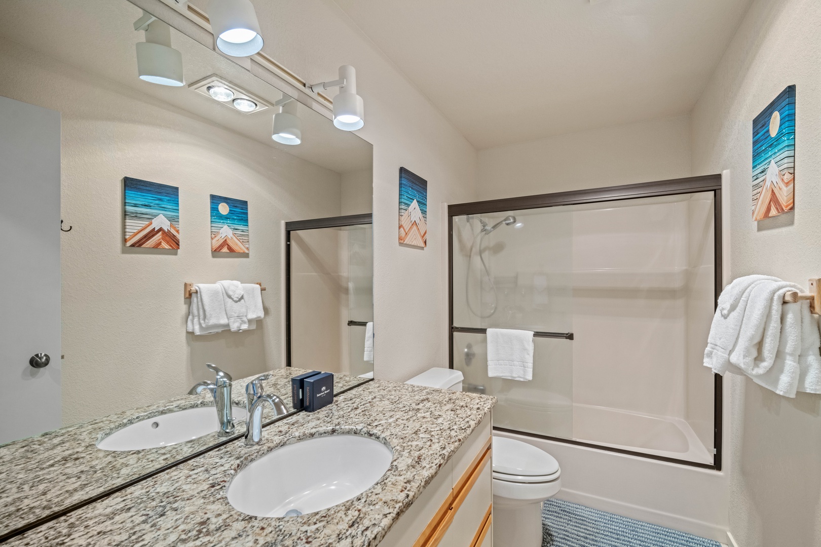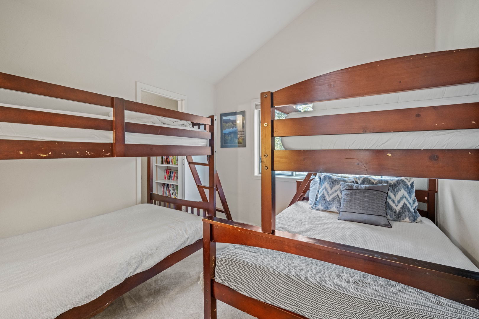 Inside, the home is thoughtfully set up for families, with plenty of games and books to keep kids entertained. Sleeping arrangements include two en-suite bedrooms with queen beds and private bathrooms, along with a fun bunk room featuring two sets of bunk beds. For added entertainment, the garage is equipped with a ping pong table.