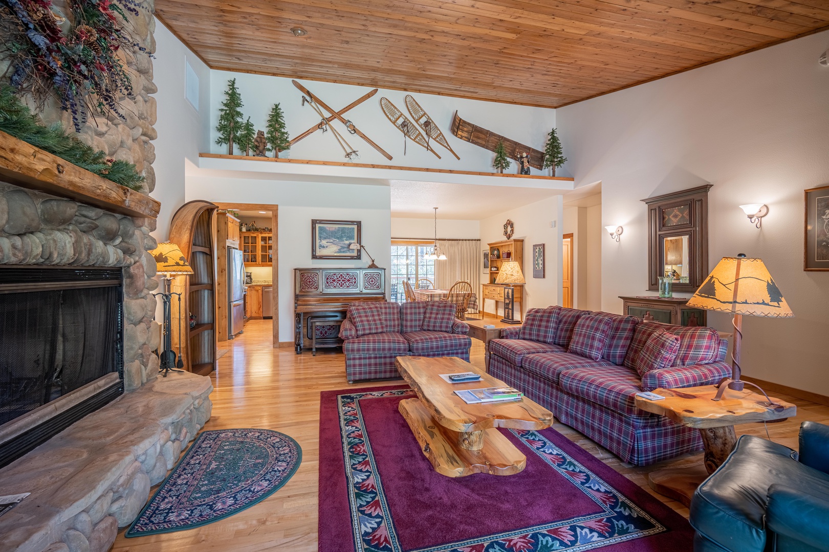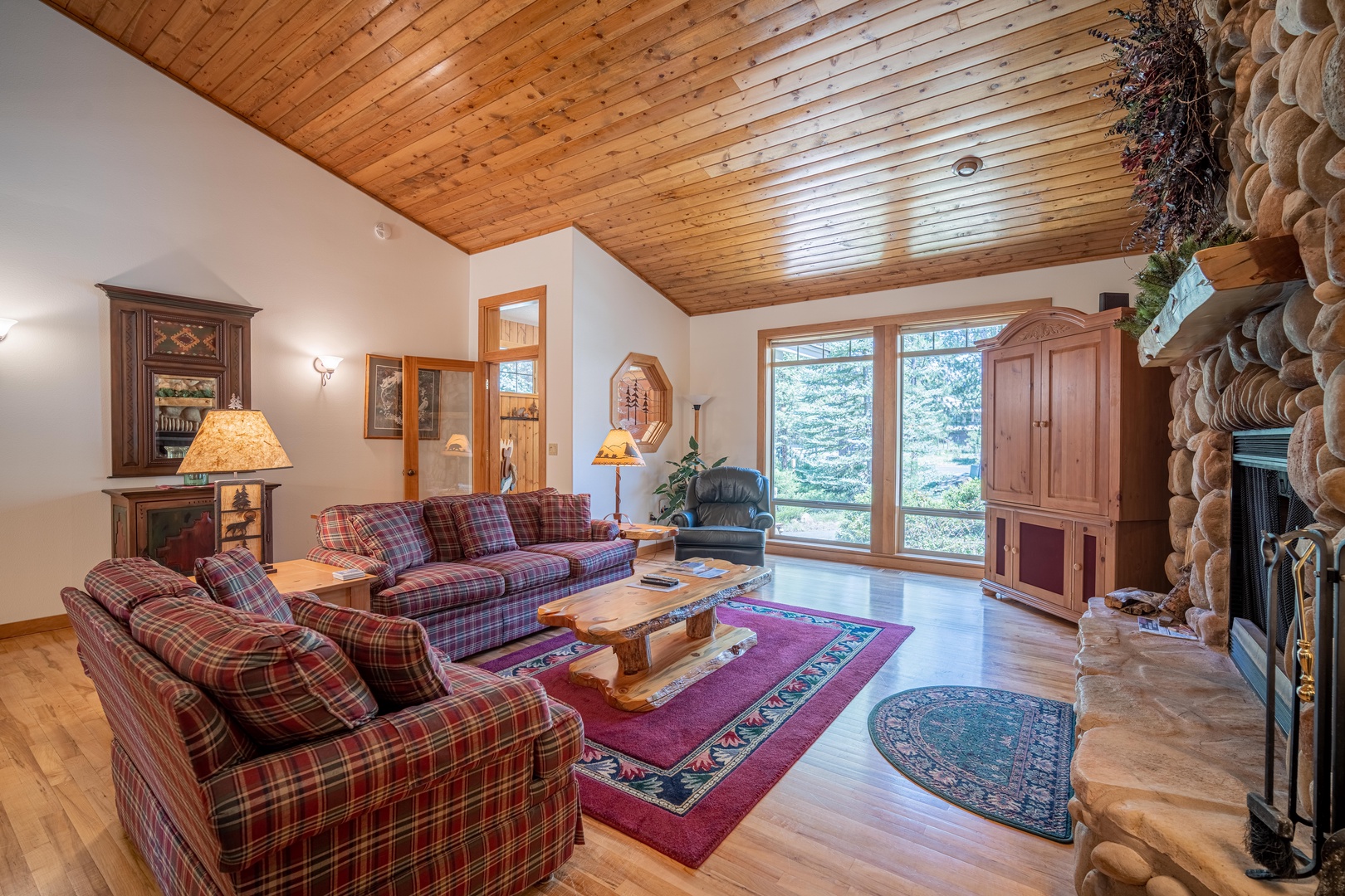 • Spacious living room décor is warm and comfortable featuring a large wood-burning fireplace & flat screen TV with DVD/Blue-Ray